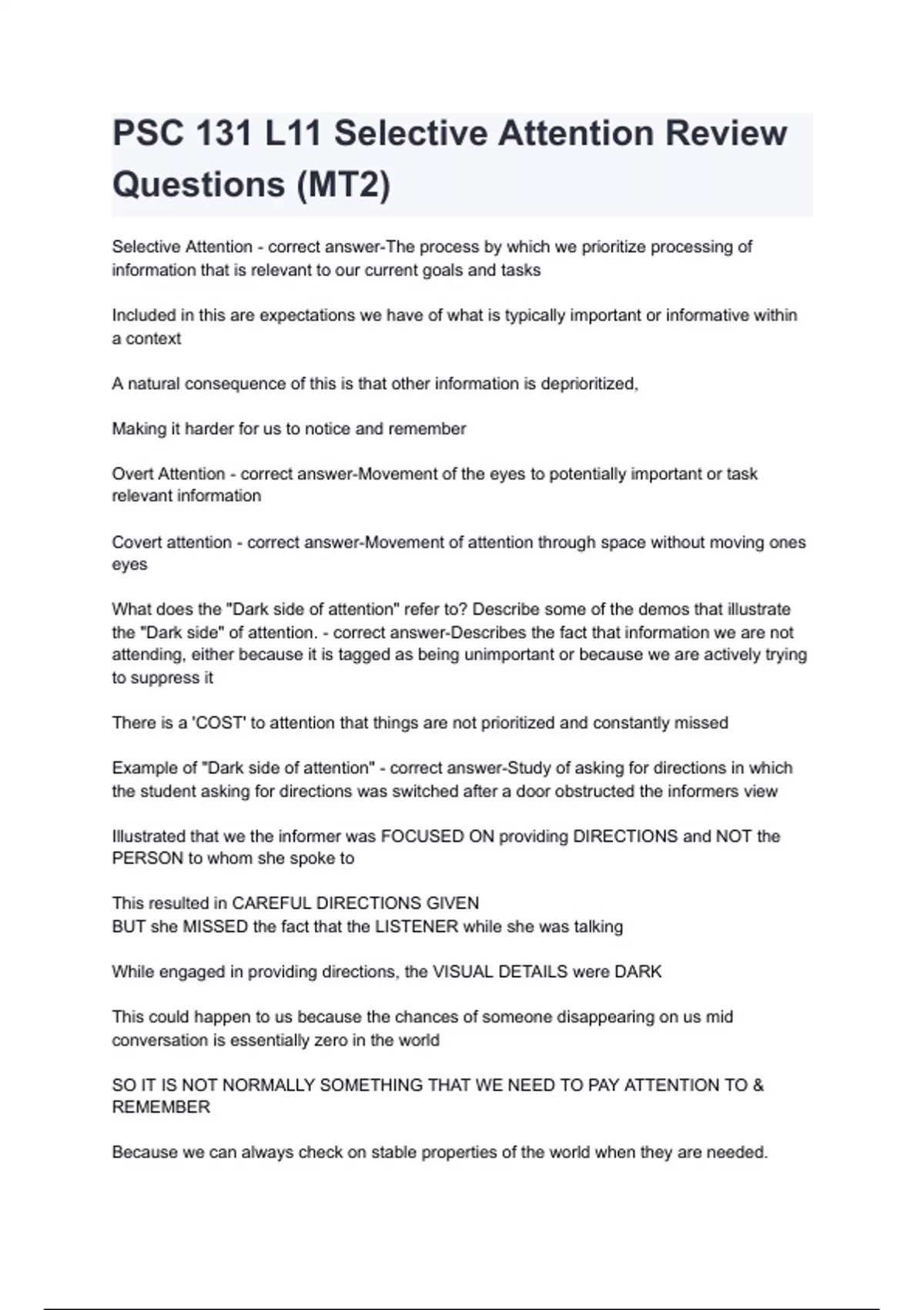 PSC 131 L11 Selective Attention Review Questions (MT2) with complete solution