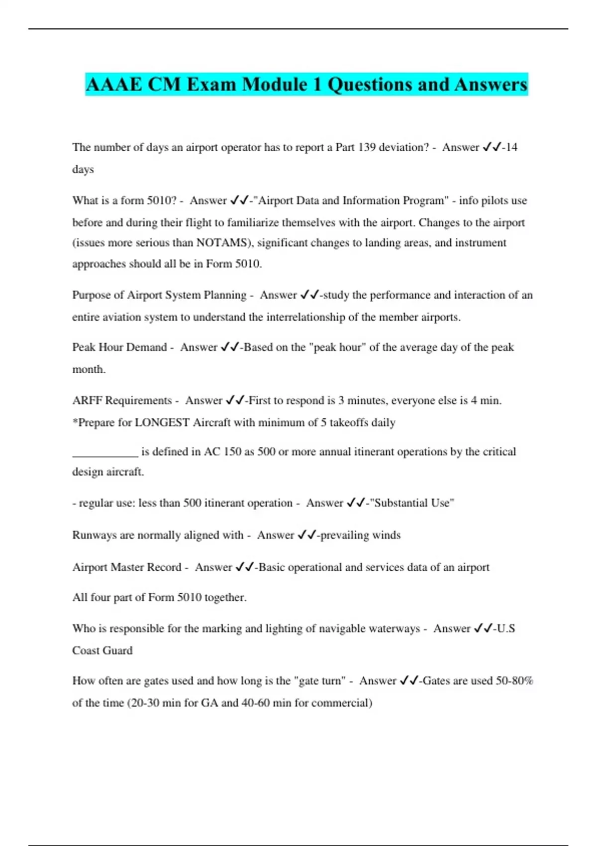 AAAE CM Exam Module 1 Questions and Answers The number of days an airport operator has to report a Part 139 deviation? - Answer ️️ -14 days What is a form 5010? - Answer ️️ -"Airport Data and Information Program" - info pilots use before and during their flight to familiarize themselves with the airport. Changes to the airport (issues more serious than NOTAMS), significant changes to landing areas, and instrument approaches should all be in Form 5010. Purpose of Airport System Planning - Answer ️️ -study the performance and interaction of an entire aviation system to understand the interrelationship of the member airports. Peak Hour Demand - Answer ️️ -Based on the "peak hour" of the average day of the peak month. ARFF Requirements - Answer ️️ -First to respond is 3 minutes, everyone else is 4 min. *Prepare for LONGEST Aircraft with minimum of 5 takeoffs daily ___________ is defined in AC 150 as 500 or more annual itinerant operations by the critical design aircraft. - regular use: less than 500 itinerant operation - Answer ️️ -"Substantial Use" Runways are normally aligned with - Answer ️️ -prevailing winds Airport Master Record - Answer ️️ -Basic operational and services data of an airport All four part of Form 5010 together. Who is responsible for the marking and lighting of navigable waterways - Answer ️️ -U.S Coast Guard