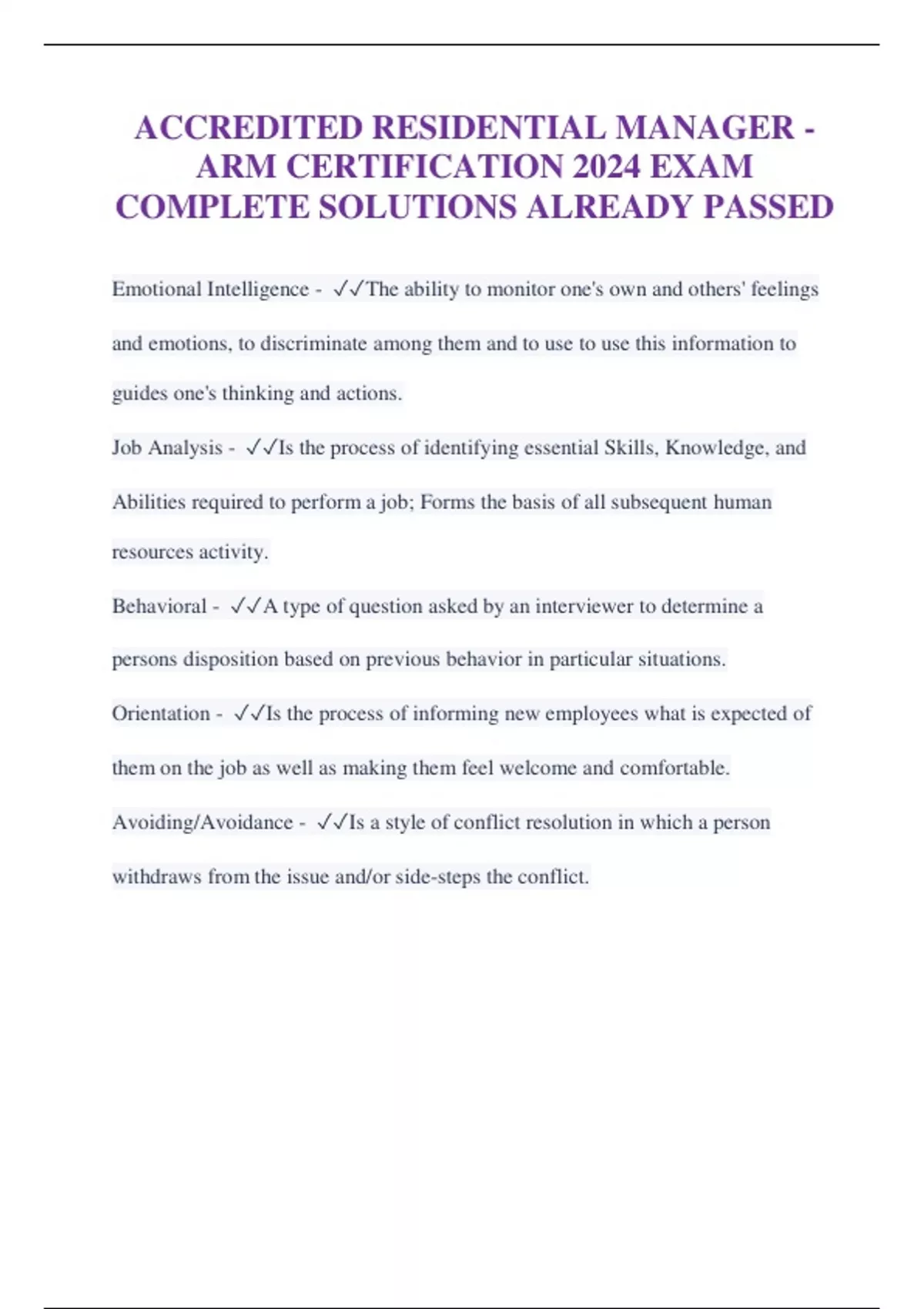 ACCREDITED RESIDENTIAL MANAGER - ARM CERTIFICATION 2024 EXAM COMPLETE SOLUTIONS ALREADY PASSED Emotional Intelligence - The ability to monitor one's own and others' feelings and emotions, to discriminate among them and to use to use this information to guides one's thinking and actions. Job Analysis - Is the process of identifying essential Skills, Knowledge, and Abilities required to perform a job; Forms the basis of all subsequent human resources activity. Behavioral - A type of question asked by an interviewer to determine a persons disposition based on previous behavior in particular situations. Orientation - Is the process of informing new employees what is expected of them on the job as well as making them feel welcome and comfortable. Avoiding/Avoidance - Is a style of conflict resolution in which a person withdraws from the issue and/or side-steps the conflict