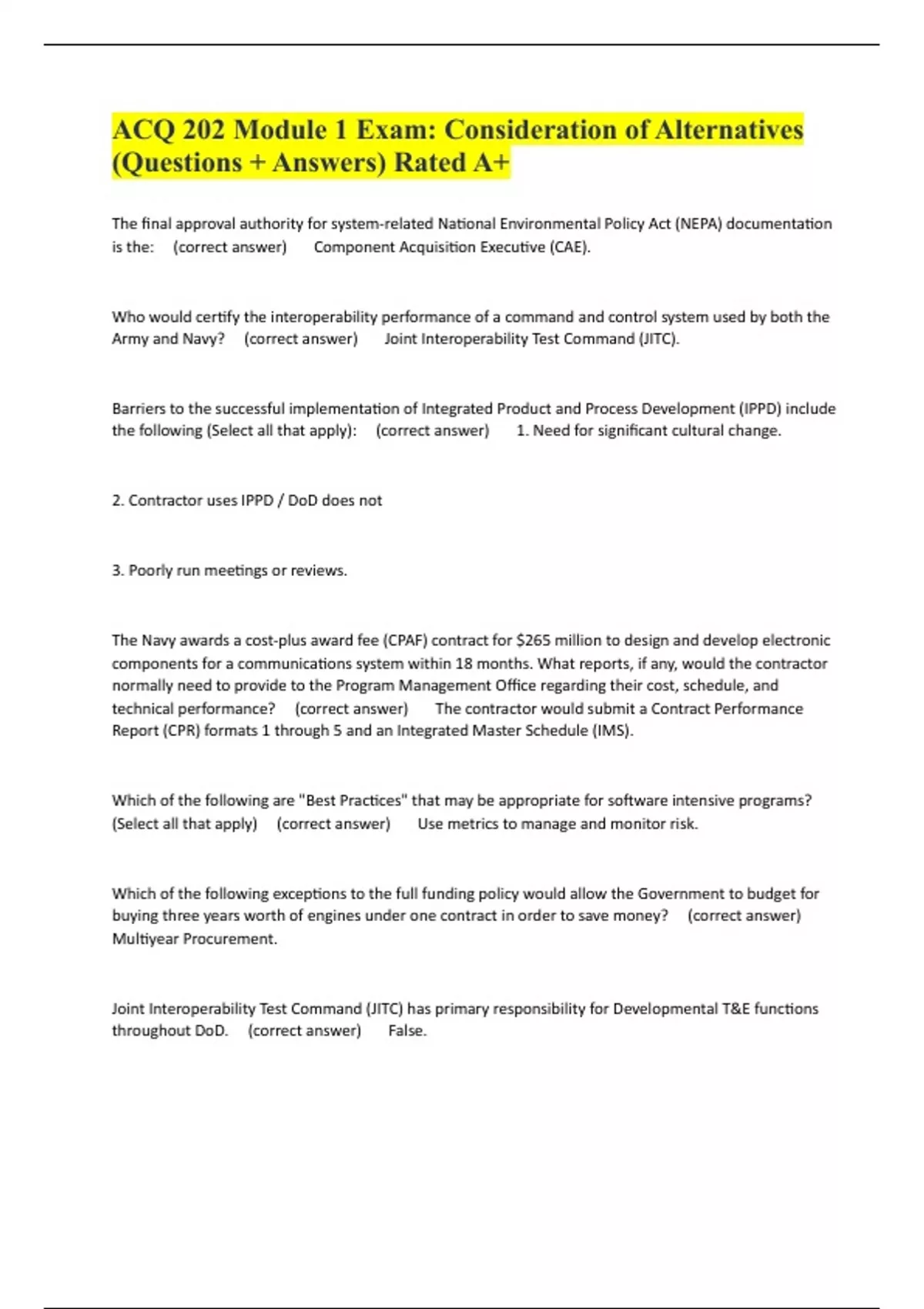 ACQ 202 Module 1 Exam: Consideration of Alternatives (Questions + Answers) Rated A+
