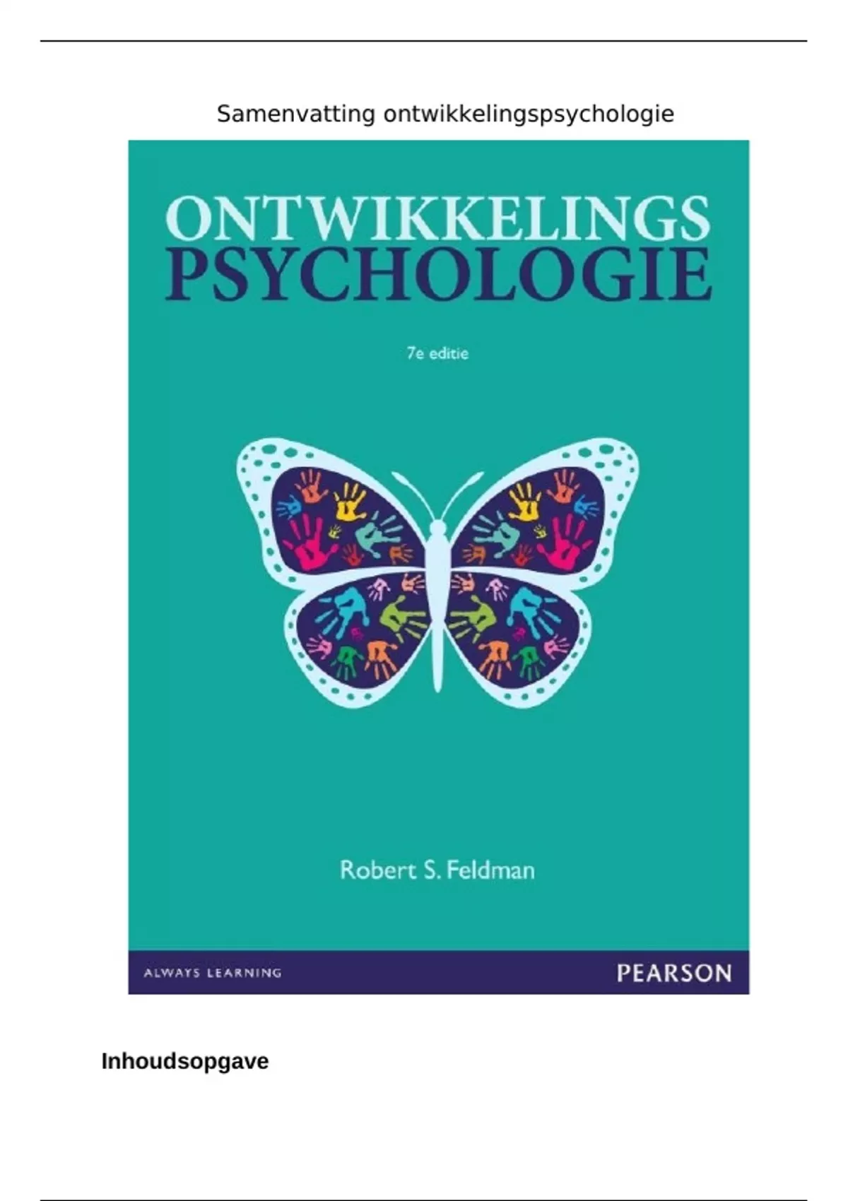 Dit is een 'korte' samenvatting van het vak ontwikkelingspsychologie. De samenvatting bestaat uit 16 hoofdstukken met een bijhorende begrippenlijst van deze hoofdstukken. Ik heb met deze samenvatting het vak kunnen afronden met een 7.