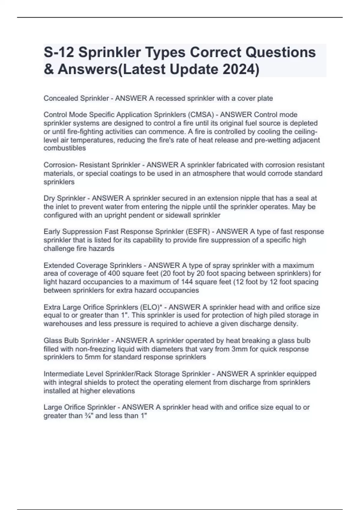 S-12 Sprinkler Types Correct Questions & Answers(Latest Update 2024)