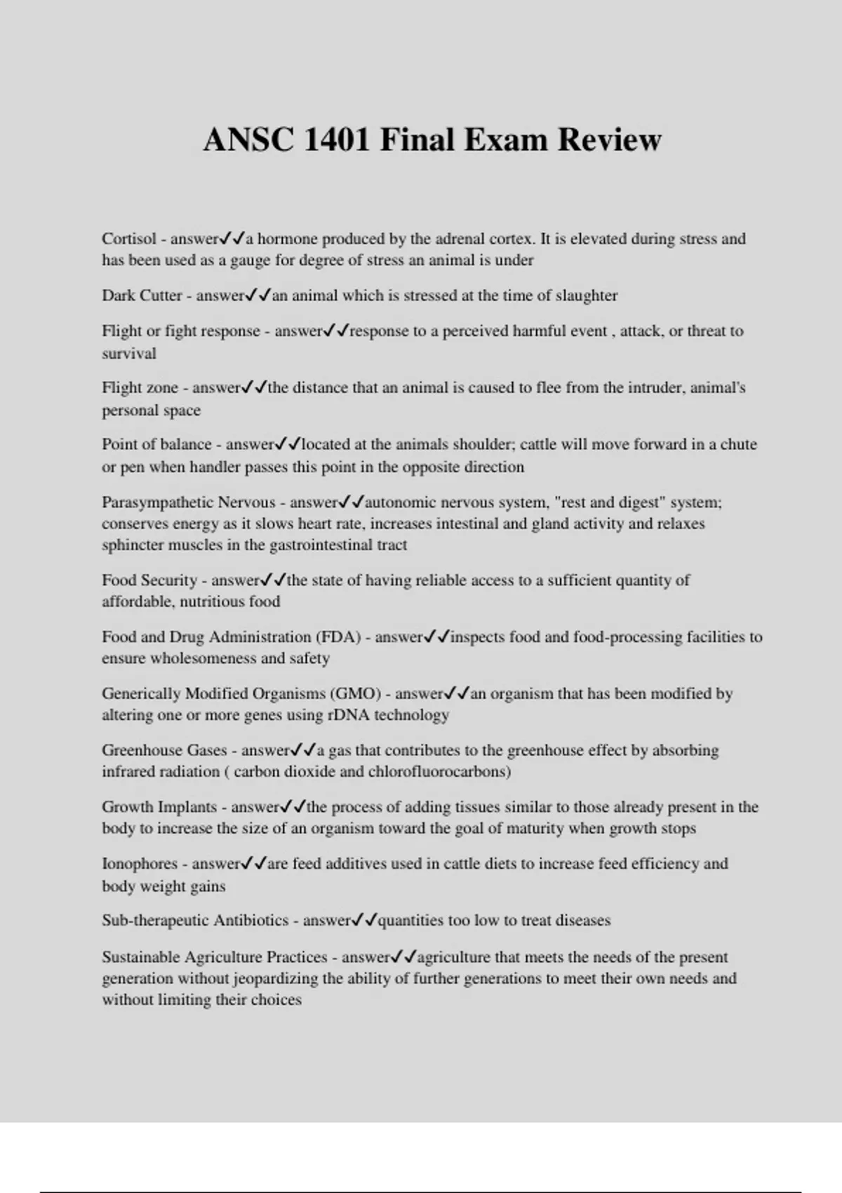 ANSC 1401 Final Exam Review Cortisol - answera hormone produced by the adrenal cortex. It is elevated during stress and has been used as a gauge for degree of stress an animal is under Dark Cutter - answeran animal which is stressed at the time of slaughter Flight or fight response - answerresponse to a perceived harmful event , attack, or threat to survival Flight zone - answerthe distance that an animal is caused to flee from the intruder, animal's personal space Point of balance - answerlocated at the animals shoulder; cattle will move forward in a chute or pen when handler passes this point in the opposite direction Parasympathetic Nervous - answerautonomic nervous system, "rest and digest" system; conserves energy as it slows heart rate, increases intestinal and gland activity and relaxes sphincter muscles in the gastrointestinal tract Food Security - answerthe state of having reliable access to a sufficient quantity of affordable, nutritious food Food and Drug Administration (FDA) - answerinspects food and food-processing facilities to ensure wholesomeness and safety Generically Modified Organisms (GMO) - answeran organism that has been modified by altering one or more genes using rDNA technology Greenhouse Gases - answera gas that contributes to the greenhouse effect by absorbing infrared radiation ( carbon dioxide and chlorofluorocarbons) Growth Implants - answerthe process of adding tissues similar to those already present in the body to increase the size of an organism toward the goal of maturity when growth stops Ionophores - answerare feed additives used in cattle diets to increase feed efficiency and body weight gains Sub-therapeutic Antibiotics - answerquantities too low to treat diseases Sustainable Agriculture Practices - answeragriculture that meets the needs of the present generation without jeopardizing the ability of further generations to meet their own needs and without limiting their choices Therapeutic Antibiotics - answerused to treat clinically ill animals inhibit or kill bacteria; controls infectious diseases caused by pathogenic bacteria Technology - answerthe application of scientific knowledge for practical purposes, especially in industry Animal Science - answerthe combination of disciplines that together comprise the study of domestic animals; traditionally associated with livestock species; includes pet and companion animals Biometry - answerthe application of statistics to topics in biology Biofuel - answerfuel derived from biological materials such as crops and animal waste Carcass By-Products - answerthe remaining carcass (bones, organs, blood, beaks, etc) that is made into an additional food such as meal Domestic Livestock - answerthose species raised in a agricultural setting to produce commodities such as food, fiber and labor Ethology - answerthe study of animals in their natural environment; studies are used to compare species FAO - answerFood and Agricultural Organization of the United Nations; the largest autonomous agency within the United Nations; works to alleviate poverty and hunger by promoting agricultural development assistance Green Revolution - answerDramatic improvements in grain production in developing countries during the 1960s to the 1980s because of technological innovation and application Xenotransplantation - answertransplanting animal organs into humans Adaptation - answerthe sum of the changes an animal makes in response to environmental stimuli Centrally Planned Economy - answeran economy under government control; Prices, labor, and other economic inputs are controlled and are not allowed to fluctuate in accordance with supple and demand Developed Agriculture - answeradvanced farming practices on worldwide level Extensively Managed - answeragricultural systems practiced in a manner that spreads human time and attention across vast acreages and/or large number of animals Intensively Managed - answeranimals produced in intensive system are kept in more concentrated conditions, fed higher quality feeds, and have much more labor , technology, and overall attention directed to them