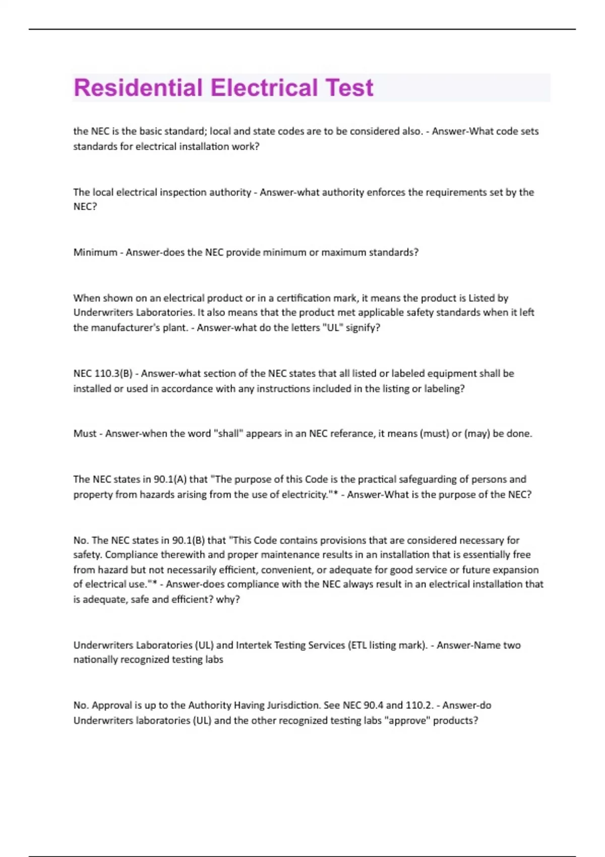 the NEC is the basic standard; local and state codes are to be considered also. - Answer-What code sets standards for electrical installation work? The local electrical inspection authority - Answer-what authority enforces the requirements set by the NEC? Minimum - Answer-does the NEC provide minimum or maximum standards? When shown on an electrical product or in a certification mark, it means the product is Listed by Underwriters Laboratories. It also means that the product met applicable safety standards when it left the manufacturer's plant. - Answer-what do the letters "UL" signify? NEC 110.3(B) - Answer-what section of the NEC states that all listed or labeled equipment shall be installed or used in accordance with any instructions included in the listing or labeling? Must - Answer-when the word "shall" appears in an NEC referance, it means (must) or (may) be done. The NEC states in 90.1(A) that "The purpose of this Code is the practical safeguarding of persons and property from hazards arising from the use of electricity."* - Answer-What is the purpose of the NEC? No. The NEC states in 90.1(B) that "This Code contains provisions that are considered necessary for safety. Compliance therewith and proper maintenance results in an installation that is essentially free from hazard but not necessarily efficient, convenient, or adequate for good service or future expansion of electrical use."* - Answer-does compliance with the NEC always result in an electrical installation that is adequate, safe and efficient? why? Underwriters Laboratories (UL) and Intertek Testing Services (ETL listing mark). - Answer-Name two nationally recognized testing labs No. Approval is up to the Authority Having Jurisdiction. See NEC 90.4 and 110.2. - Answer-do Underwriters laboratories (UL) and the other recognized testing labs "approve" products?They test the products for conformance to applicable safety standards. - Answer-what do the testing laboratories do? Informative Annex J includes information that is intended to assist the users of the Code in properly considering the various electrical design constraints of other building systems and are part of the 2010 ADA Standards for Accessible Design. The Informative Annex is not enforceable. The basic NEC rules still apply. Local communities, counties, states, and/or other govern-mental bodies might have requirements. Check with your local inspection authority. Ask them if there are any requirements or suggestions that you might need to fo - Answer-does the NEC make suggestions about how to wire a house that will be occupied by handicapped persons? OSHA - Answer-What federal organization dictates requirements for work-related safety issues? Turn off the power on the circuit you are working on, tag it, and lock the disconnect in the OFF position. - Answer-what can you do to reduce or eliminate the possibility of receiving an electric shock when working on electrical circuits? The NEC defines a qualified person as "One who has skills and knowledge related to the construction and operation of the electrical equipment and installations and has received safety training to recognize and avoid the hazards involved."* (70E) - Answer-what is the NEC definition of a "qualified person" Not necessarily, usually depending on the voltage. - Answer-are low-voltage systems totally safe? NFPA 70E - Answer-what NFPA standard specifically covers safety in the workplace? Personal Protective Equipment. - Answer-What does PPE stand for? An arc flash is the tremendous explosion that happens when a short circuit or ground fault occurs on an electrical system that is capable of delivering high fault current. - Answer-briefly explain an arc flash Apprenticeship programs, Consumer Product Safety Commission, National Safety Council, Occupational Safety & Health Act, National Fire Protection Association, and the American Heart Association - Answerwhere might you obtain information about on the job safety and safety training?No - Answer-is it a safe practice to use a step ladder in which the spreaders have not been fully locked? You are responsible for your own safety - Answer-If a step ladder collapses whose fault is it?