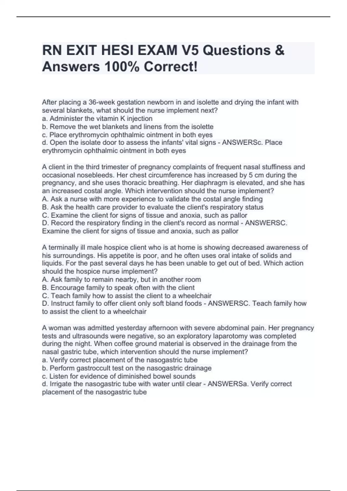 After placing a 36-week gestation newborn in and isolette and drying the infant with several blankets, what should the nurse implement next? a. Administer the vitamin K injection b. Remove the wet blankets and linens from the isolette c. Place erythromycin ophthalmic ointment in both eyes d. Open the isolate door to assess the infants' vital signs - ANSWERSc. Place erythromycin ophthalmic ointment in both eyes A client in the third trimester of pregnancy complaints of frequent nasal stuffiness and occasional nosebleeds. Her chest circumference has increased by 5 cm during the pregnancy, and she uses thoracic breathing. Her diaphragm is elevated, and she has an increased costal angle. Which intervention should the nurse implement? A. Ask a nurse with more experience to validate the costal angle finding B. Ask the health care provider to evaluate the client's respiratory status C. Examine the client for signs of tissue and anoxia, such as pallor D. Record the respiratory finding in the client's record as normal - ANSWERSC. Examine the client for signs of tissue and anoxia, such as pallor A terminally ill male hospice client who is at home is showing decreased awareness of his surroundings. His appetite is poor, and he often uses oral intake of solids and liquids. For the past several days he has been unable to get out of bed. Which action should the hospice nurse implement? A. Ask family to remain nearby, but in another room B. Encourage family to speak often with the client C. Teach family how to assist the client to a wheelchair D. Instruct family to offer client only soft bland foods - ANSWERSC. Teach family how to assist the client to a wheelchair A woman was admitted yesterday afternoon with severe abdominal pain. Her pregnancy tests and ultrasounds were negative, so an exploratory laparotomy was completed during the night. When coffee ground material is observed in the drainage from the nasal gastric tube, which intervention should the nurse implement? a. Verify correct placement of the nasogastric tube b. Perform gastroccult test on the nasogastric drainage c. Listen for evidence of diminished bowel sounds d. Irrigate the nasogastric tube with water until clear - ANSWERSa. Verify correct placement of the nasogastric tube The nurse is reviewing the laboratory values for a client with acute pancreatitis who reports that the abdominal pain is not as severe as it was on admission. Which laboratory test should the nurse review to evaluate the client's clinical recovery? a. Lipase b. Creatinine c. Bilirubin d. Glucose - ANSWERSa. Lipase While assessing a client who had a laparotomy the previous day, the nurse notices that 300