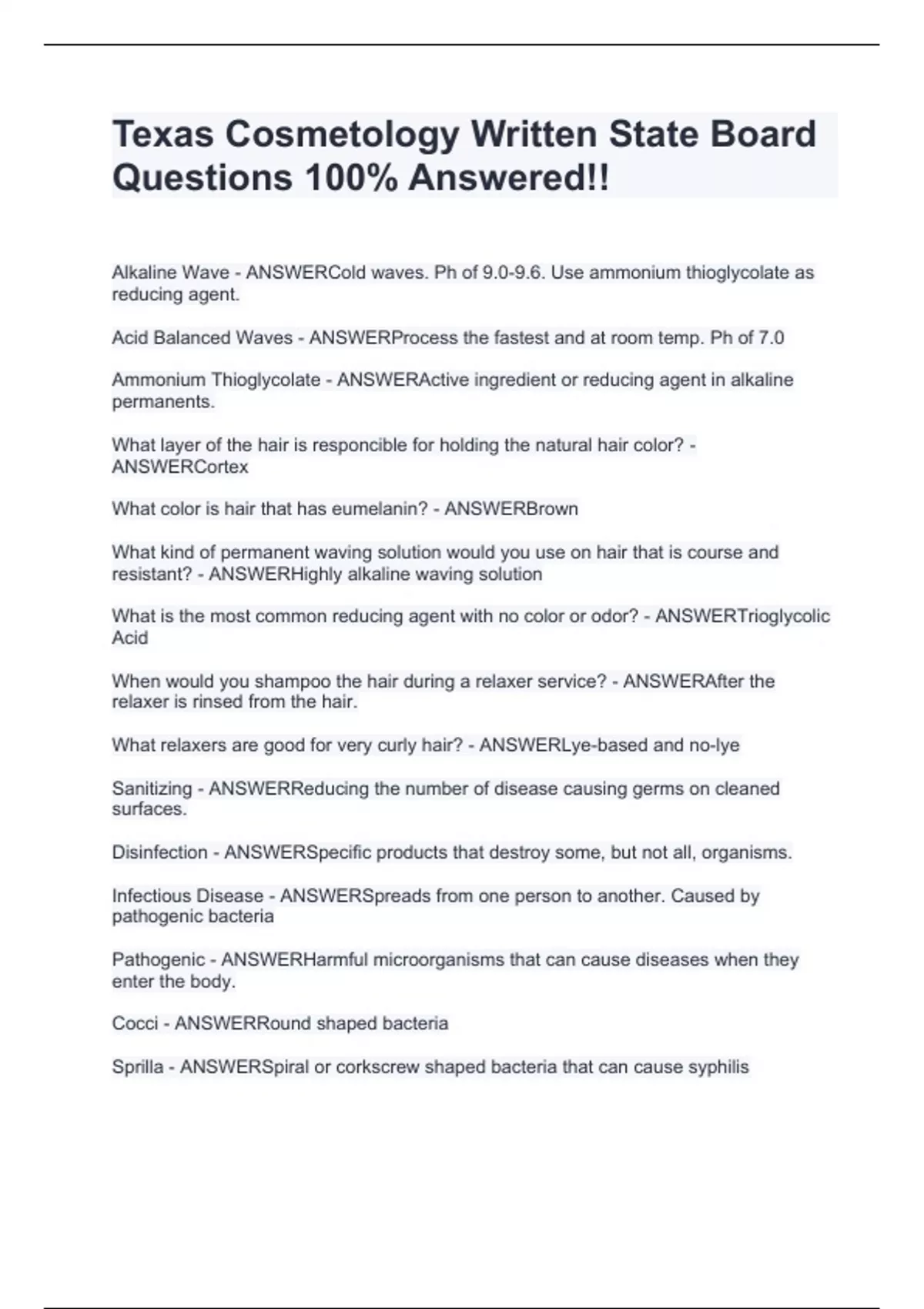 Texas Cosmetology Written State Board Questions 100% Answered!!