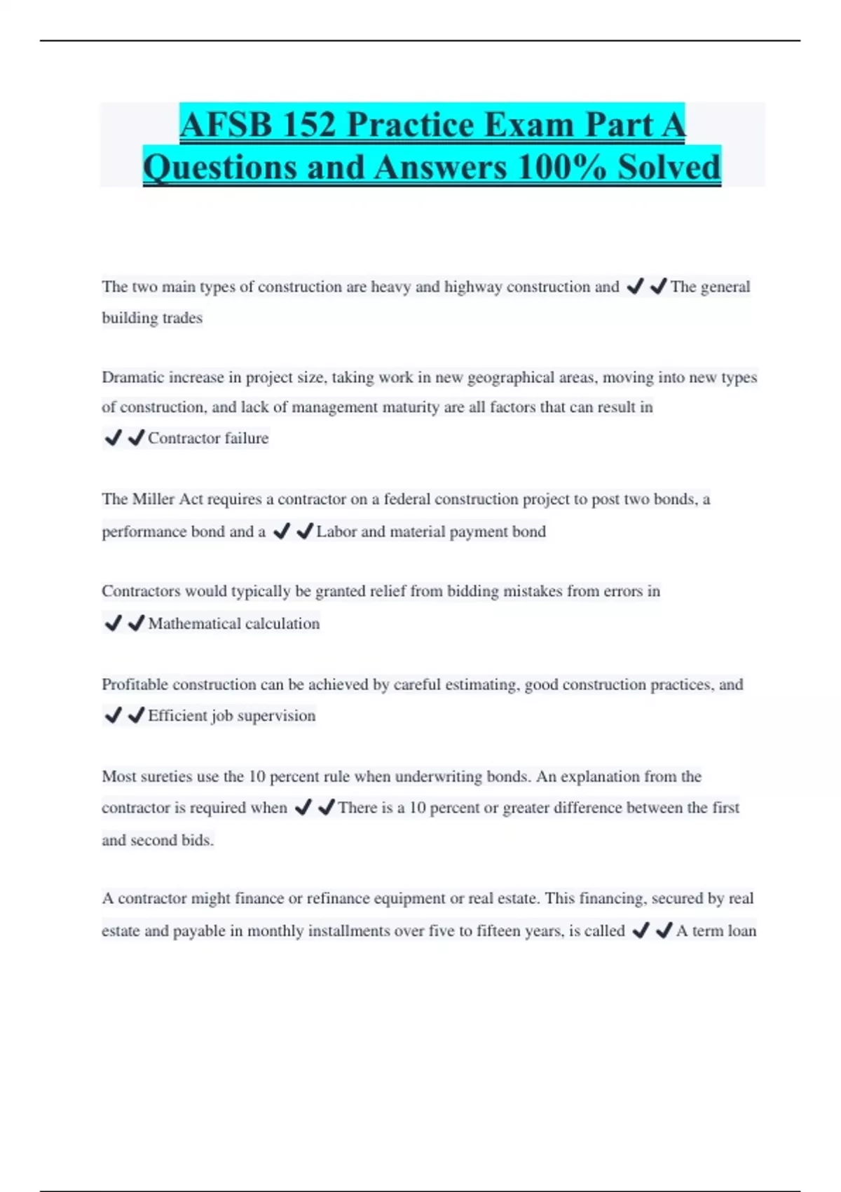 AFSB 152 Practice Exam Part A Questions and Answers 100% Solved The two main types of construction are heavy and highway construction and ️️The general building trades Dramatic increase in project size, taking work in new geographical areas, moving into new types of construction, and lack of management maturity are all factors that can result in ️️Contractor failure The Miller Act requires a contractor on a federal construction project to post two bonds, a performance bond and a ️️Labor and material payment bond Contractors would typically be granted relief from bidding mistakes from errors in ️️Mathematical calculation