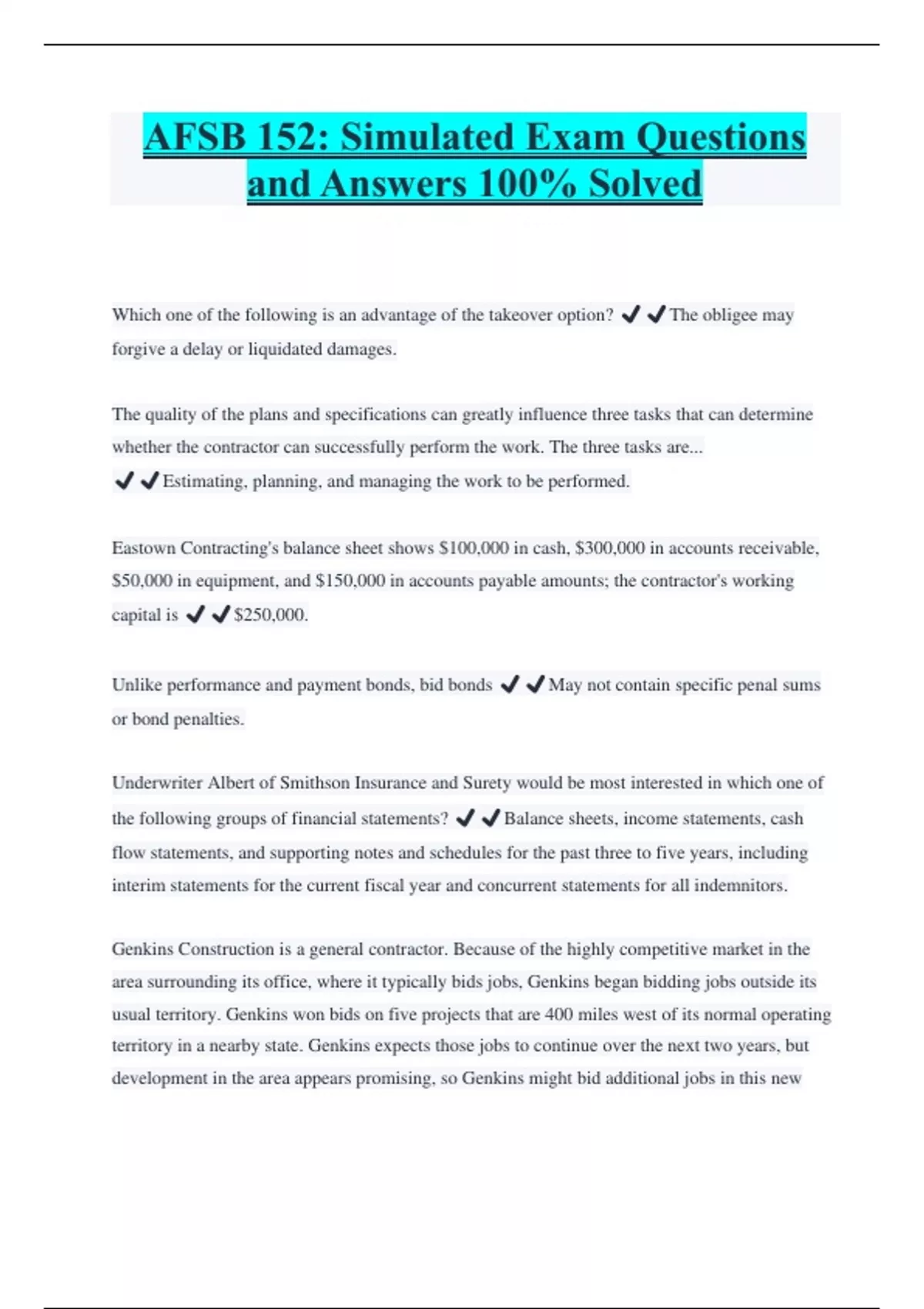 AFSB 152: Simulated Exam Questions and Answers 100% Solved Which one of the following is an advantage of the takeover option? ️️The obligee may forgive a delay or liquidated damages. The quality of the plans and specifications can greatly influence three tasks that can determine whether the contractor can successfully perform the work. The three tasks are... ️️Estimating, planning, and managing the work to be performed. Eastown Contracting's balance sheet shows $100,000 in cash, $300,000 in accounts receivable, $50,000 in equipment, and $150,000 in accounts payable amounts; the contractor's working capital is ️️$250,000