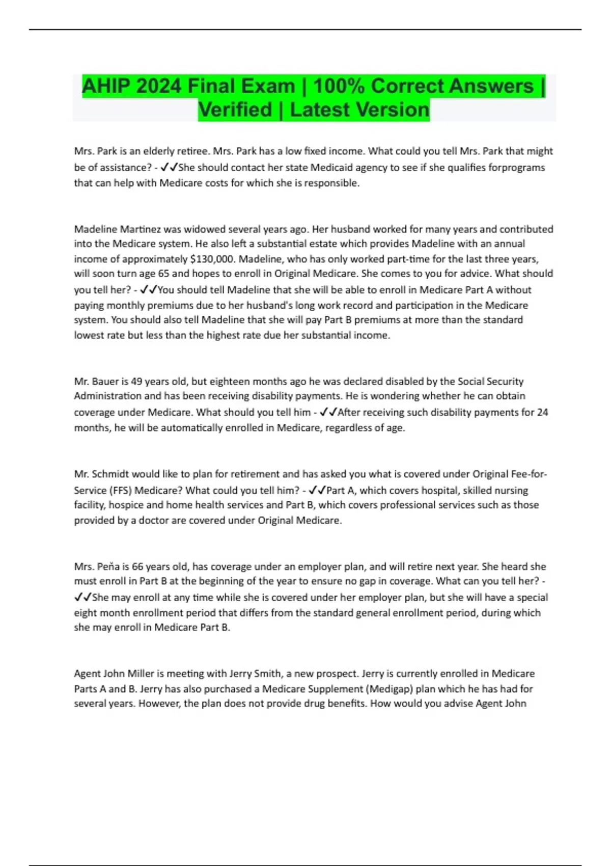 Mrs. Park is an elderly retiree. Mrs. Park has a low fixed income. What could you tell Mrs. Park that might be of assistance? - She should contact her state Medicaid agency to see if she qualifies forprograms that can help with Medicare costs for which she is responsible. Madeline Martinez was widowed several years ago. Her husband worked for many years and contributed into the Medicare system. He also left a substantial estate which provides Madeline with an annual income of approximately $130,000. Madeline, who has only worked part-time for the last three years, will soon turn age 65 and hopes to enroll in Original Medicare. She comes to you for advice. What should you tell her? - You should tell Madeline that she will be able to enroll in Medicare Part A without paying monthly premiums due to her husband's long work record and participation in the Medicare system. You should also tell Madeline that she will pay Part B premiums at more than the standard lowest rate but less than the highest rate due her substantial income. Mr. Bauer is 49 years old, but eighteen months ago he was declared disabled by the Social Security Administration and has been receiving disability payments. He is wondering whether he can obtain coverage under Medicare. What should you tell him - After receiving such disability payments for 24 months, he will be automatically enrolled in Medicare, regardless of age. Mr. Schmidt would like to plan for retirement and has asked you what is covered under Original Fee-forService (FFS) Medicare? What could you tell him? - Part A, which covers hospital, skilled nursing facility, hospice and home health services and Part B, which covers professional services such as those provided by a doctor are covered under Original Medicare. Mrs. Peňa is 66 years old, has coverage under an employer plan, and will retire next year. She heard she must enroll in Part B at the beginning of the year to ensure no gap in coverage. What can you tell her? - She may enroll at any time while she is covered under her employer plan, but she will have a special eight month enrollment period that differs from the standard general enrollment period, during which she may enroll in Medicare Part B. Agent John Miller is meeting with Jerry Smith, a new prospect. Jerry is currently enrolled in Medicare Parts A and B. Jerry has also purchased a Medicare Supplement (Medigap) plan which he has had for several years. However, the plan does not provide drug benefits. How would you advise Agent JohnMiller to proceed? - Tell prospect Jerry Smith that he should consider adding a standalone Part D prescription drug coverage policy to his present coverage. Mr. Diaz continued working with his company and was insured under his employer's group plan until he reached age 68. He has heard that there is a premium penalty for those who did not sign up for Part B when first eligible and wants to know how much he will have to pay. What should you tell him? - The penalty will be a permanent 10% increase in his Part B premium for every 12-month period that passed during which he could have enrolled and did not. Ms. Moore plans to retire when she turns 65 in a few months. She is in excellent health and will have considerable income when she retires. She is concerned that her income will make it impossible for her to qualify for Medicare. What could you tell her to address her concern? - Medicare is a program for people age 65 or older and those under age 65 with certain disabilities, end-stage renal disease, and Lou Gehrig's disease so she will be eligible for Medicare