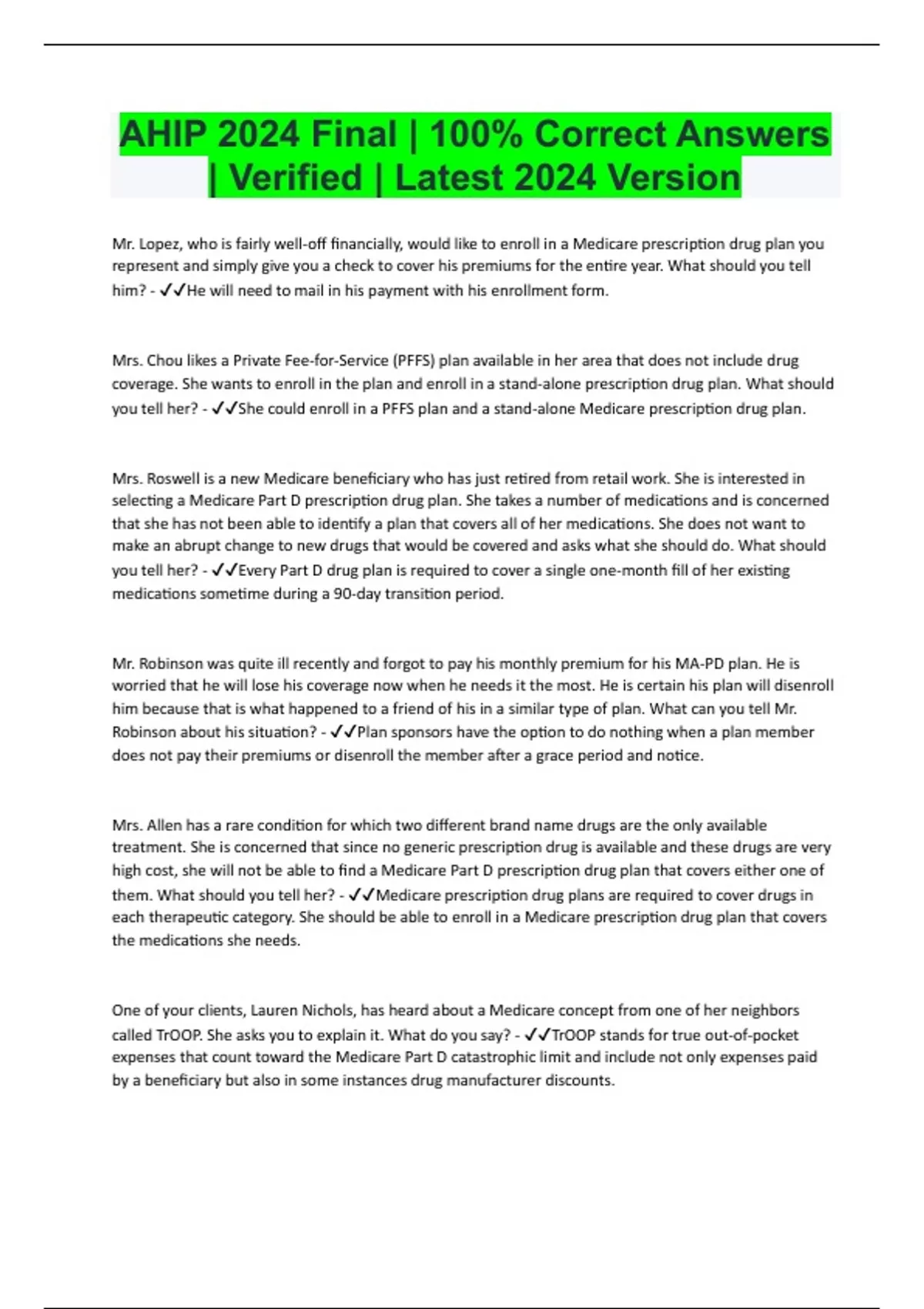 Mr. Lopez, who is fairly well-off financially, would like to enroll in a Medicare prescription drug plan you represent and simply give you a check to cover his premiums for the entire year. What should you tell him? - He will need to mail in his payment with his enrollment form. Mrs. Chou likes a Private Fee-for-Service (PFFS) plan available in her area that does not include drug coverage. She wants to enroll in the plan and enroll in a stand-alone prescription drug plan. What should you tell her? - She could enroll in a PFFS plan and a stand-alone Medicare prescription drug plan. Mrs. Roswell is a new Medicare beneficiary who has just retired from retail work. She is interested in selecting a Medicare Part D prescription drug plan. She takes a number of medications and is concerned that she has not been able to identify a plan that covers all of her medications. She does not want to make an abrupt change to new drugs that would be covered and asks what she should do. What should you tell her? - Every Part D drug plan is required to cover a single one-month fill of her existing medications sometime during a 90-day transition period. Mr. Robinson was quite ill recently and forgot to pay his monthly premium for his MA-PD plan. He is worried that he will lose his coverage now when he needs it the most. He is certain his plan will disenroll him because that is what happened to a friend of his in a similar type of plan. What can you tell Mr. Robinson about his situation? - Plan sponsors have the option to do nothing when a plan member does not pay their premiums or disenroll the member after a grace period and notice. Mrs. Allen has a rare condition for which two different brand name drugs are the only available treatment. She is concerned that since no generic prescription drug is available and these drugs are very high cost, she will not be able to find a Medicare Part D prescription drug plan that covers either one of them. What should you tell her? - Medicare prescription drug plans are required to cover drugs in each therapeutic category. She should be able to enroll in a Medicare prescription drug plan that covers the medications she needs. One of your clients, Lauren Nichols, has heard about a Medicare concept from one of her neighbors called TrOOP. She asks you to explain it. What do you say? - TrOOP stands for true out-of-pocket expenses that count toward the Medicare Part D catastrophic limit and include not only expenses paid by a beneficiary but also in some instances drug manufacturer discounts.Mrs. Fiore is a retired federal worker with coverage under a Federal Employee Health Benefits (FEHB) plan that includes creditable drug coverage. She is ready to turn 65 and become Medicare eligible for the first time. What issues might she consider about whether to enroll in a Medicare prescription drug plan? - She could compare the coverage to see if the Medicare Part D plan offers better benefits and coverage than the FEHB plan for the specific medications she needs and whether any additional benefits are worth the Part D premium costs on top of her FEHB contribution. Mrs. Shields is covered by Original Medicare. She sustained a hip fracture and is being successfully treated for that condition. However, she and her physicians feel that after her lengthy hospital stay she will need a month or two of nursing and rehabilitative care. What should you tell them about Original Medicare's coverage of care in a skilled nursing facility? - Medicare will cover Mrs. Shield's skilled nursing services provided during the first 20 days of her stay, after which she would have a copay until she has been in the facility for 100 days. Madeline Martinez was widowed several years ago. Her husband worked for many years and contributed into the Medicare system. He also left a substantial estate which provides Madeline with an annual income of approximately $130,000. Madeline, who has only worked part-time for the last three years, will soon turn age 65 and hopes to enroll in Original Medicare. She comes to you for advice. What should you tell her? - You should tell Madeline that she will be able to enroll in Medicare Part A without paying monthly premiums due to her husband's long work record and participation in the Medicare system. You should also tell Madeline that she will pay Part B premiums at more than the standard lowest rate but less than the highest rate due her substantial income. Winthrop Brokerage wishes to place an advertisement in the local newspaper that says: "We offer Medicare Advantage plans offered by AB Health and Top Choice Health. Contact us if you would like to learn more." Which of the following best describes the obligation(s) of Winthrop Brokerage regarding the advertisement? - Winthrop Brokerage does not need to submit the advertisement to CMS for prior approval because it does not include information about the plans' benefits structures, cost-sharing, or information about measures or ranking standards. Daniel is a middle-income Medicare beneficiary. He has chronic bronchitis, putting him at severe risk for pneumonia. Otherwise, he has no problems functioning. Which type of SNP is likely to be most appropriate for him? - C-SNP Ms. Henderson believes that she will qualify for Medicare Coverage when she turns 65, without paying any premiums, because she has been working for 40 years and paying Medicare taxes. What should youtell her? - To obtain Part B coverage, she must pay a standard monthly premium, though it is higher for individuals with higher incomes. You are scheduled to give a sales presentation at a local senior center at which a drawing will be held for a prize. At the beginning of the presentation, which of the following must you do? - Clearly state that no obligation exists to enroll if a gift or prize is being offered. Mrs. Paterson is concerned about the deductibles and co-payments associated with Original Medicare. What can you tell her about Medigap as an option to 