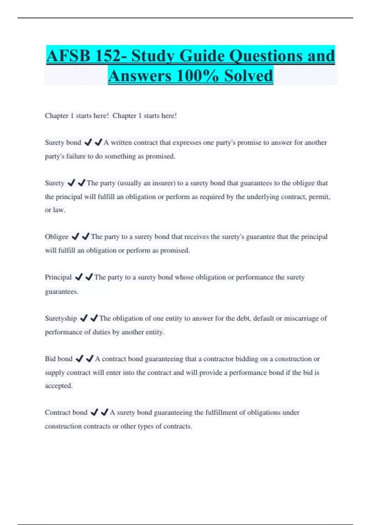 AFSB 152- Study Guide Questions and Answers 100% Solved Chapter 1 starts here! Chapter 1 starts here! Surety bond ️️A written contract that expresses one party's promise to answer for another party's failure to do something as promised. Surety ️️The party (usually an insurer) to a surety bond that guarantees to the obligee that the principal will fulfill an obligation or perform as required by the underlying contract, permit, or law. Obligee ️️The party to a surety bond that receives the surety's guarantee that the principal will fulfill an obligation or perform as promised. Principal ️️The party to a surety bond whose obligation or performance the surety guarantees. Suretyship ️️The obligation of one entity to answer for the debt, default or miscarriage of performance of duties by another entity. Bid bond ️️A contract bond guaranteeing that a contractor bidding on a construction or supply contract will enter into the contract and will provide a performance bond if the bid is accepted. Contract bond ️️A surety bond guaranteeing the fulfillment of obligations under construction contracts or other types of contracts.