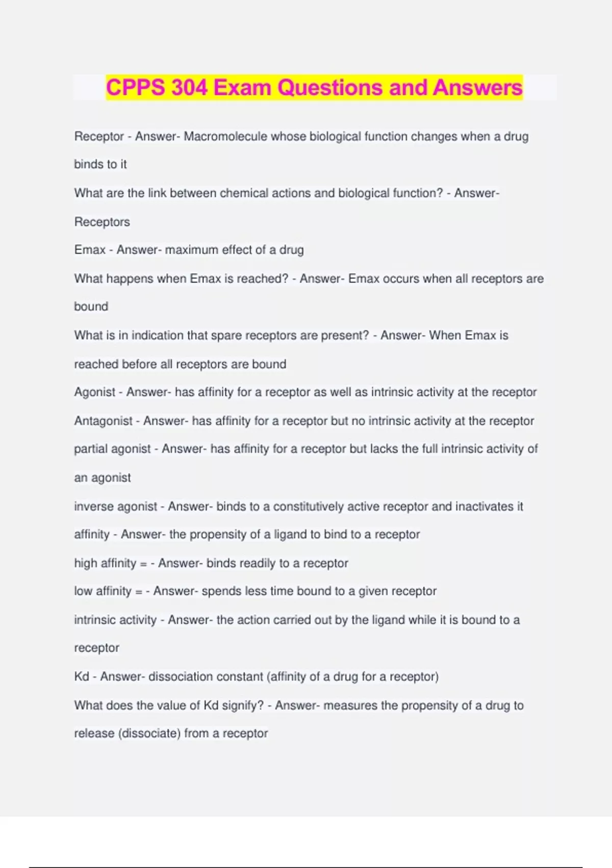 CPPS 304 Exam Questions and Answers Receptor - Answer- Macromolecule whose biological function changes when a drug binds to it What are the link between chemical actions and biological function? - Answer- Receptors Emax - Answer- maximum effect of a drug What happens when Emax is reached? - Answer- Emax occurs when all receptors are bound What is in indication that spare receptors are present? - Answer- When Emax is reached before all receptors are bound Agonist - Answer- has affinity for a receptor as well as intrinsic activity at the receptor Antagonist - Answer- has affinity for a receptor but no intrinsic activity at the receptor partial agonist - Answer- has affinity for a receptor but lacks the full intrinsic activity of an agonist inverse agonist - Answer- binds to a constitutively active receptor and inactivates it affinity - Answer- the propensity of a ligand to bind to a receptor high affinity = - Answer- binds readily to a receptor low affinity = - Answer- spends less time bound to a given receptor intrinsic activity - Answer- the action carried out by the ligand while it is bound to a receptor Kd - Answer- dissociation constant (affinity of a drug for a receptor) What does the value of Kd signify? - Answer- measures the propensity of a drug to release (dissociate) from a receptor What does a high Kd mean? - Answer- drug readily dissociates from its receptor What does a low Kd mean? - Answer- suggests high affinity for its receptor If a patient were to overdose on a reversible antagonist, what could you do? - Answer- Add more agonist Irreversible or Non-Competitive Antagonists - Answer- bind to receptor for life Reversible or Competitive Antagonists - Answer- bind and release from a receptor and are in a constant state of flux True or False, increasing the concentration of agonist will overcome the effects of an irreversible antagonist. - Answer- False What are the four types of receptors? - Answer- Ion channel, G-protein coupled, Coupled to enzymes, Intracellular What type of receptor involves Acetylcholine? - Answer- Ion channel What is the fastest type of receptor? - Answer- Ion channel What type of receptor involves adrenergics like epinephrine? - Answer- G-protein coupled What is the most common receptor type? - Answer- G-protein coupled receptor What type of receptor involves receptors dimerizing after being bound by a ligand? - Answer- Coupled to Enzyme Receptors