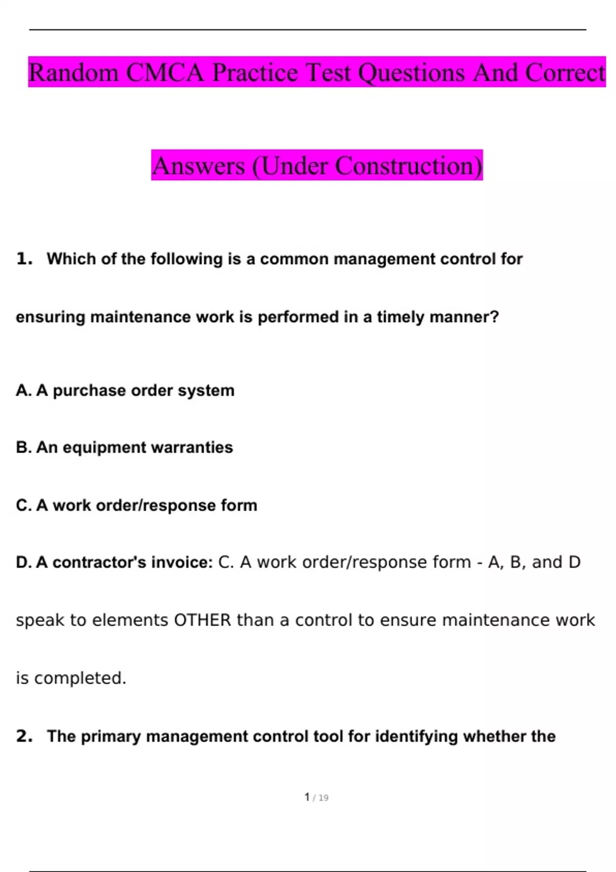 Random CMCA Practice Test Questions (Under Construction) With Verified Answers By Experts