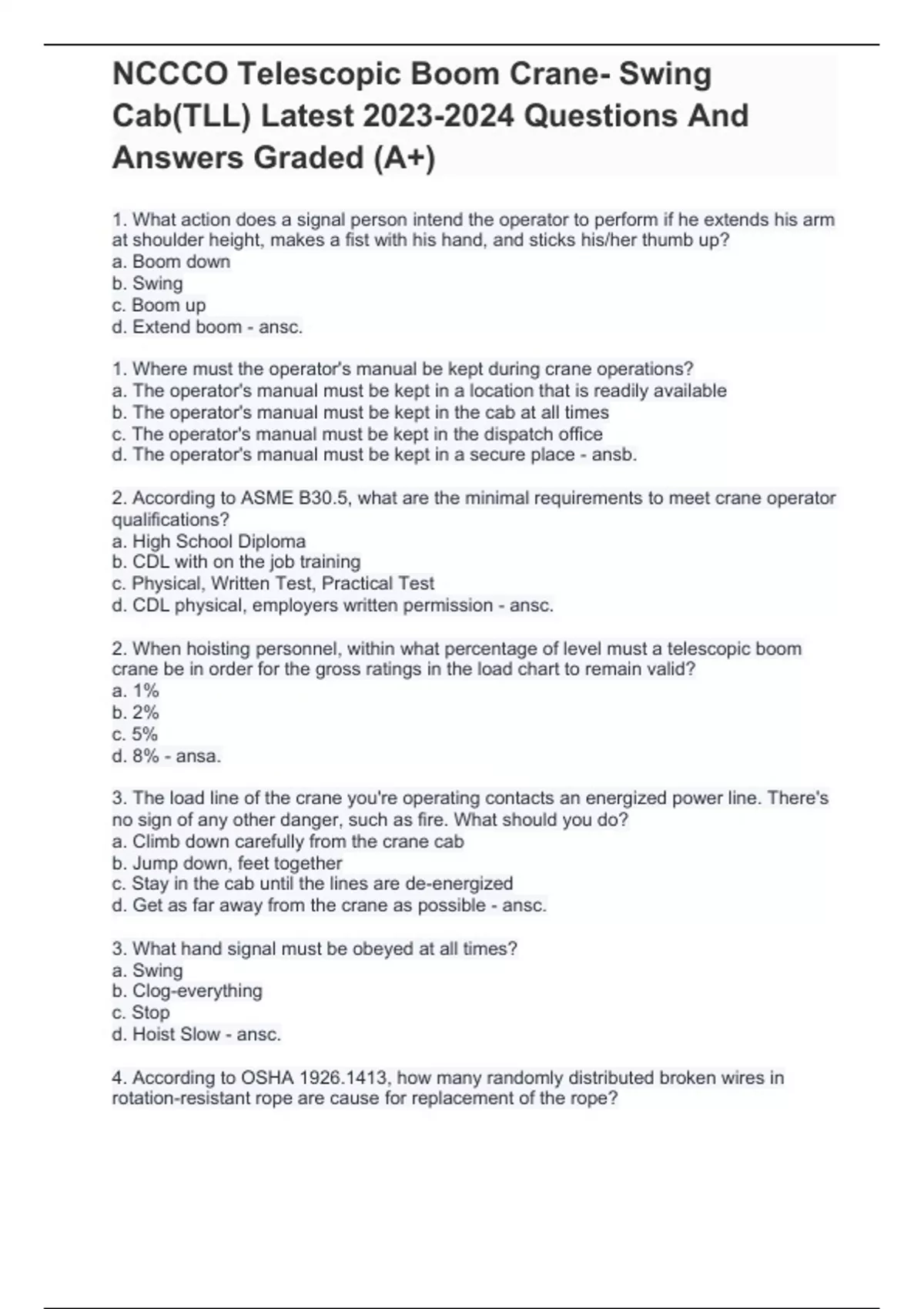 NCCCO Telescopic Boom Crane- Swing Cab(TLL) Latest Questions And Answers Graded (A+).docx