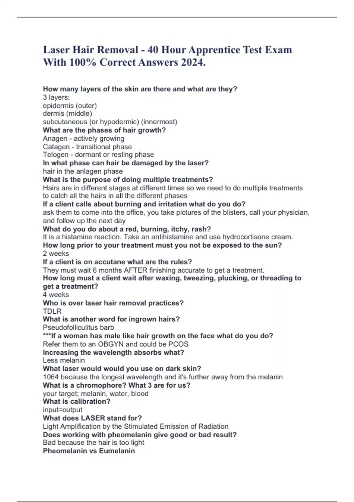 Laser Hair Removal - 40 Hour Apprentice Test Exam With 100% Correct Answers 2024. How many layers of the skin are there and what are they? 3 layers: epidermis (outer) dermis (middle) subcutaneous (or hypodermic) (innermost) What are the phases of hair growth? Anagen - actively growing Catagen - transitional phase Telogen - dormant or resting phase In what phase can hair be damaged by the laser? hair in the anlagen phase What is the purpose of doing multiple treatments? Hairs are in different stages at different times so we need to do multiple treatments to catch all the hairs in all the different phases If a client calls about burning and irritation what do you do? ask them to come into the office, you take pictures of the blisters, call your physician, and follow up the next day What do you do about a red, burning, itchy, rash? It is a histamine reaction. Take an antihistamine and use hydrocortisone cream. How long prior to your treatment must you not be exposed to the sun? 2 weeks If a client is on accutane what are the rules? They must wait 6 months AFTER finishing accurate to get a treatment. How long must a client wait after waxing, tweezing, plucking, or threading to get a treatment? 4 weeks Who is over laser hair removal practices? TDLR What is another word for ingrown hairs? Pseudofolliculitus barb ***If a woman has male like hair growth on the face what do you do? Refer them to an OBGYN and could be PCOS Increasing the wavelength absorbs what? Less melanin What laser would would you use on dark skin? 1064 because the longest wavelength and it's further away from the melanin What is a chromophore? What 3 are for us? your target; melanin, water, blood What is calibration? input=output What does LASER stand for? Light Amplification by the Stimulated Emission of Radiation Does working with pheomelanin give good or bad result? Bad because the hair is too light