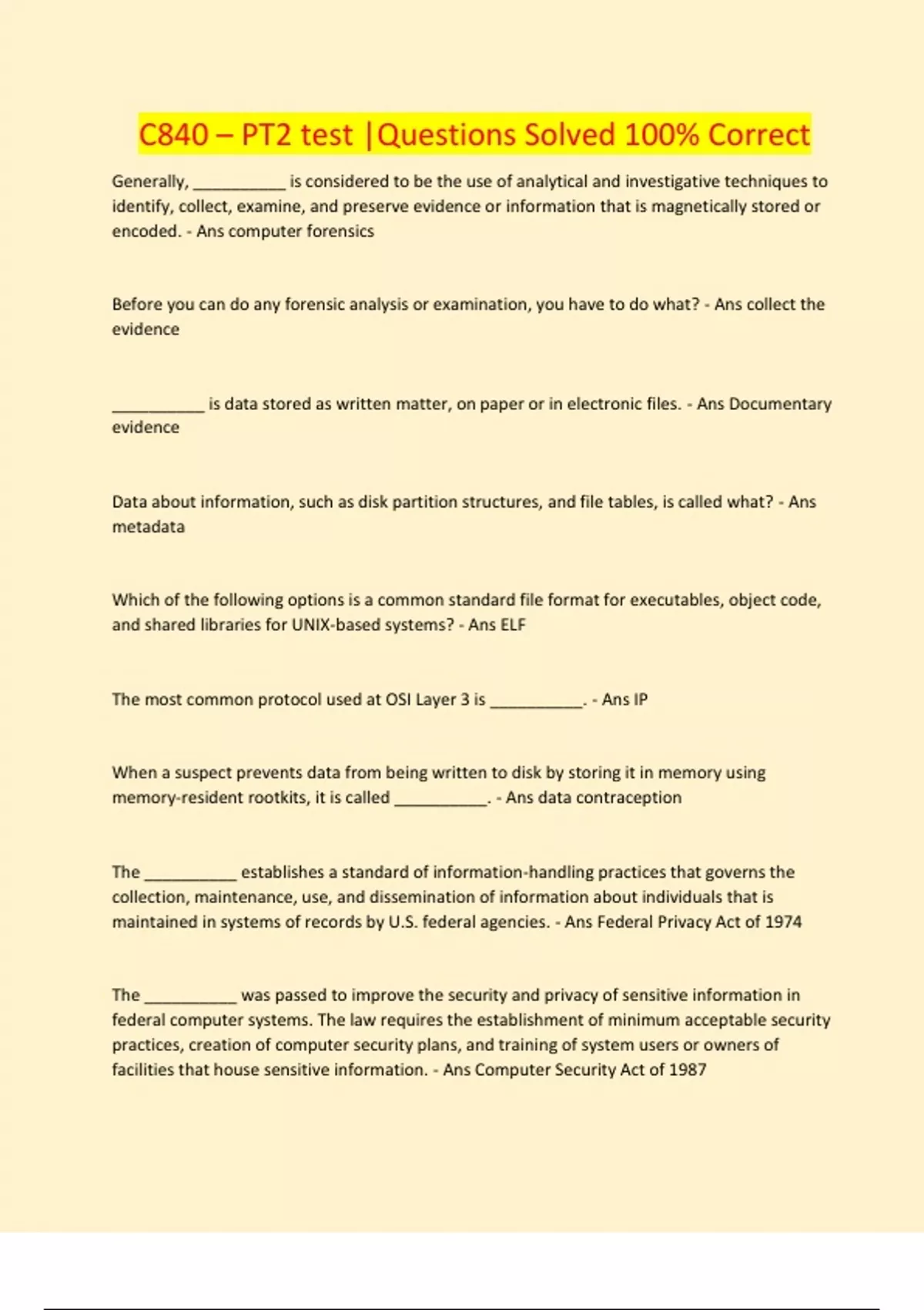c840 pt2 test questions solved 100 correct