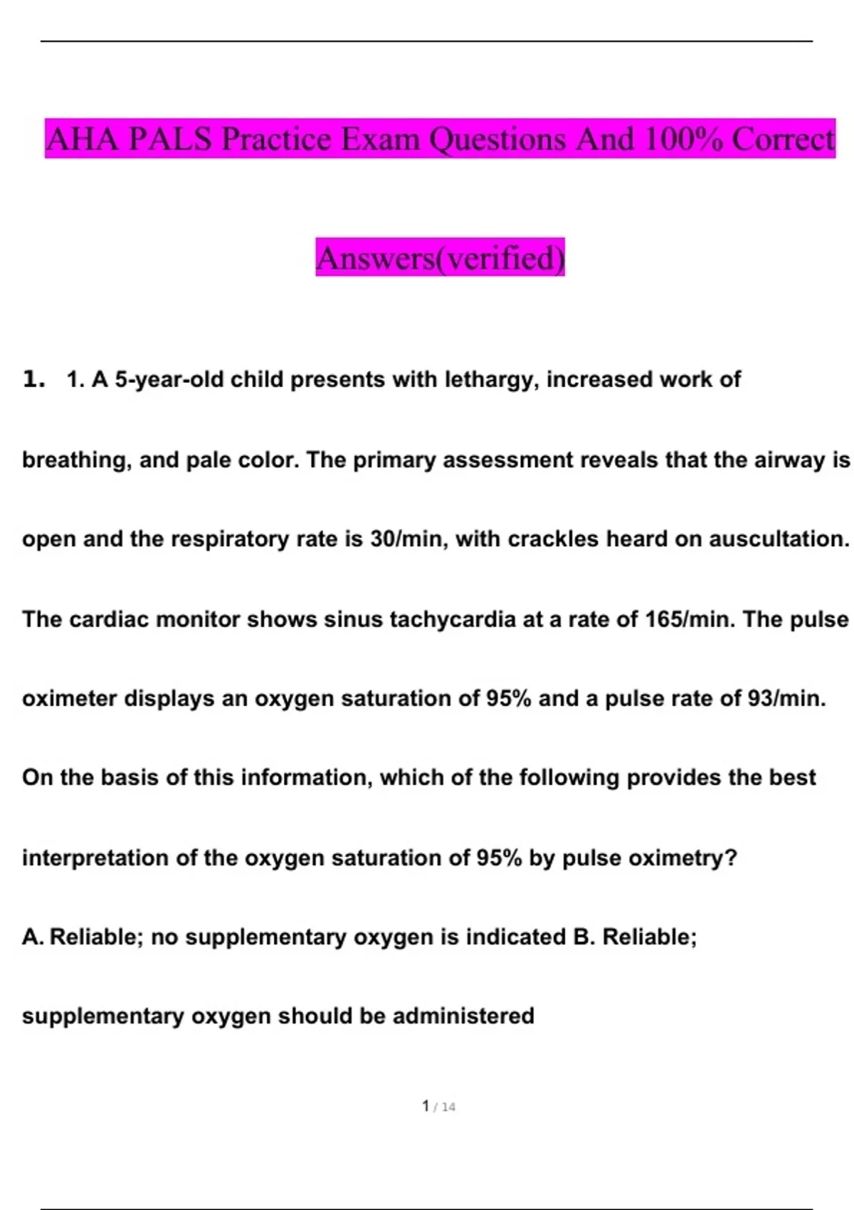 PALS Test 2024/2025 STUDY BUNDLE (COMPLETE PACKAGE DEAL)(Verified Answers)
