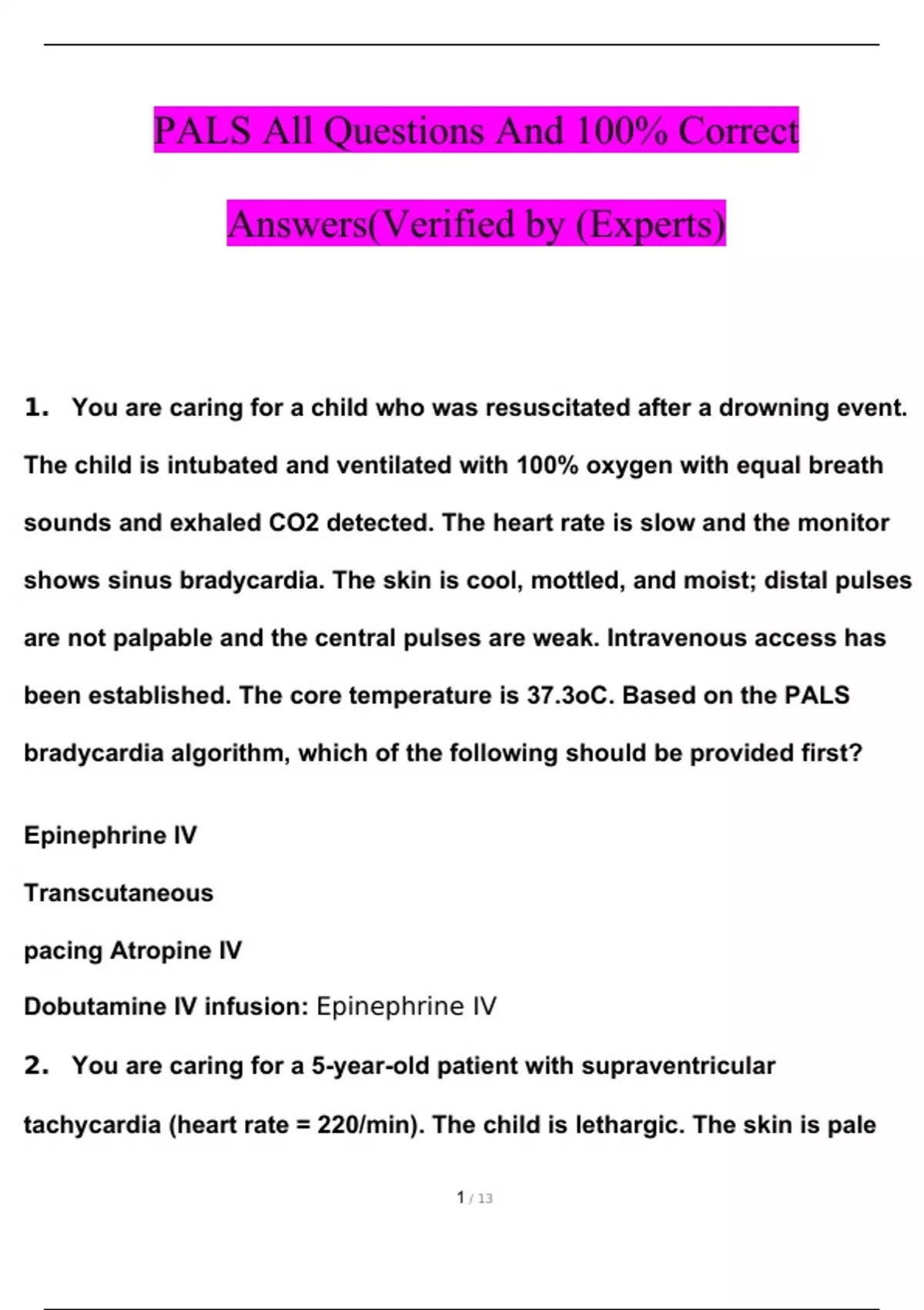 PALS Test Practice Questions and Answers 2023 (100% Verified Answers by Expert)
