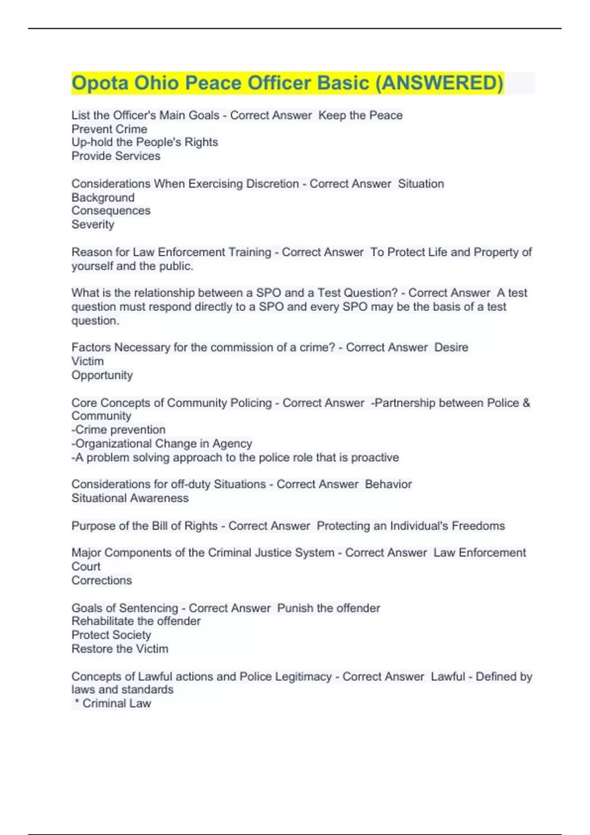 List the Officer's Main Goals - Correct Answer Keep the Peace Prevent Crime Up-hold the People's Rights Provide Services Considerations When Exercising Discretion - Correct Answer Situation Background Consequences Severity Reason for Law Enforcement Training - Correct Answer To Protect Life and Property of yourself and the public. What is the relationship between a SPO and a Test Question? - Correct Answer A test question must respond directly to a SPO and every SPO may be the basis of a test question. Factors Necessary for the commission of a crime? - Correct Answer Desire Victim Opportunity Core Concepts of Community Policing - Correct Answer -Partnership between Police & Community -Crime prevention -Organizational Change in Agency -A problem solving approach to the police role that is proactive Considerations for off-duty Situations - Correct Answer Behavior Situational Awareness Purpose of the Bill of Rights - Correct Answer Protecting an Individual's Freedoms Major Components of the Criminal Justice System - Correct Answer Law Enforcement Court Corrections Goals of Sentencing - Correct Answer Punish the offender Rehabilitate the offender Protect Society Restore the Victim Concepts of Lawful actions and Police Legitimacy - Correct Answer Lawful - Defined by laws and standards * Criminal