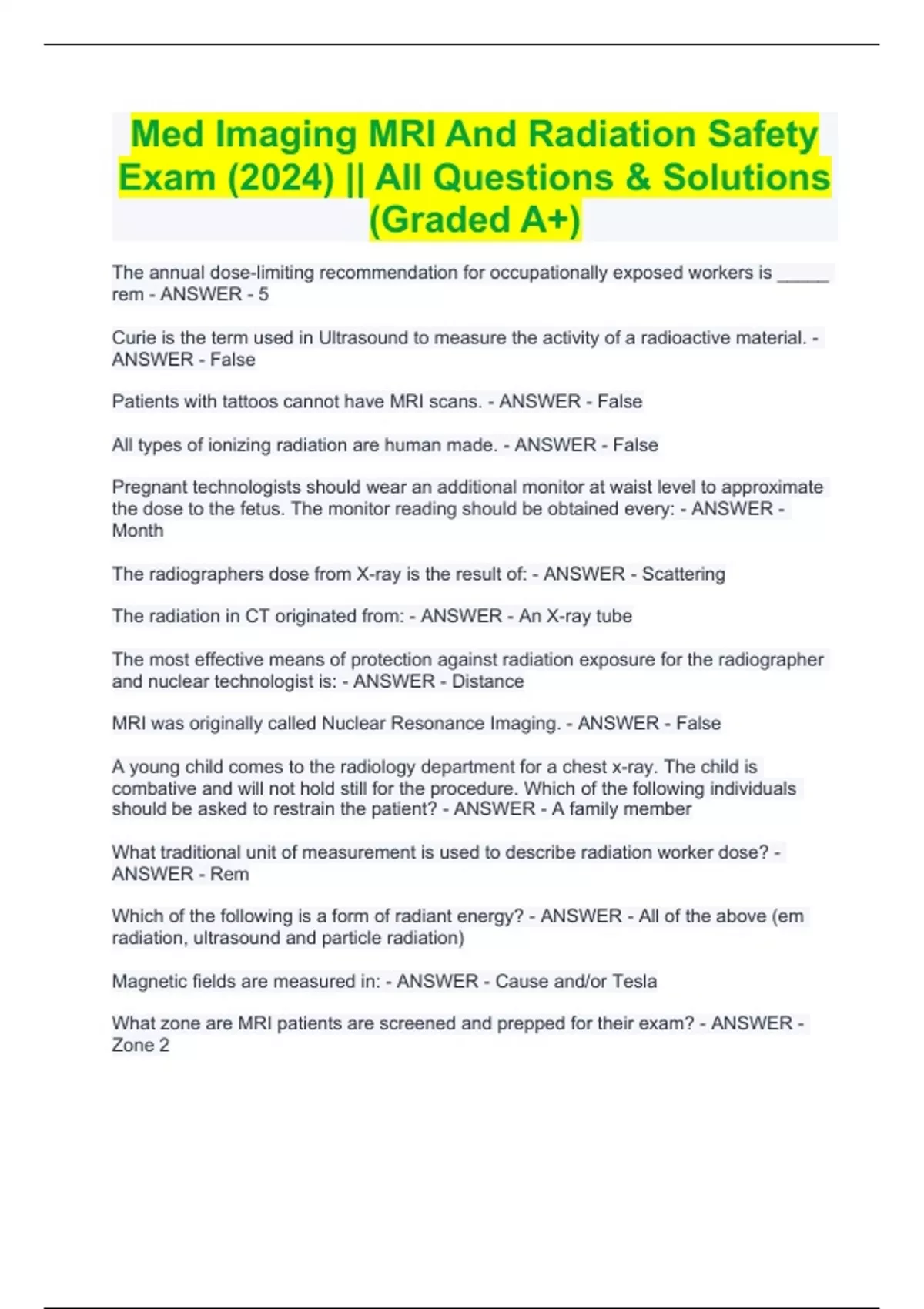 Med Imaging MRI And Radiation Safety Exam (2024) || All Questions & Solutions (Graded A+) Med Imaging MRI And Radiation Safety Exam (2024) || All Questions & Solutions (Graded A+) The annual dose-limiting recommendation for occupationally exposed workers is _____ rem - ANSWER - 5 Curie is the term used in Ultrasound to measure the activity of a radioactive material. - ANSWER - False Patients with tattoos cannot have MRI scans. - ANSWER - False All types of ionizing radiation are human made. - ANSWER - False Pregnant technologists should wear an additional monitor at waist level to approximate the dose to the fetus. The monitor reading should be obtained every: - ANSWER - Month The radiographers dose from X-ray is the result of: - ANSWER - Scattering The radiation in CT originated from: - ANSWER - An X-ray tube The most effective means of protection against radiation exposure for the radiographer and nuclear technologist is: - ANSWER - Distance MRI was originally called Nuclear Resonance Imaging. - ANSWER - False A young child comes to the radiology department for a chest x-ray. The child is combative and will not hold still for the procedure. Which of the following individuals should be asked to restrain the patient? - ANSWER - A family member What traditional unit of measurement is used to describe radiation worker dose? - ANSWER - Rem Which of the following is a form of radiant energy? - ANSWER - All of the above (em radiation, ultrasound and particle radiation) Magnetic fields are measured in: - ANSWER - Cause and/or Tesla What zone are MRI patients are screened and prepped for their exam? - ANSWER - Zone 2 A general collocation rule is the collimator should limit the exposure field to the: - ANSWER - Area of interest The force of the magnetic field is greatest at the center of the magnet
