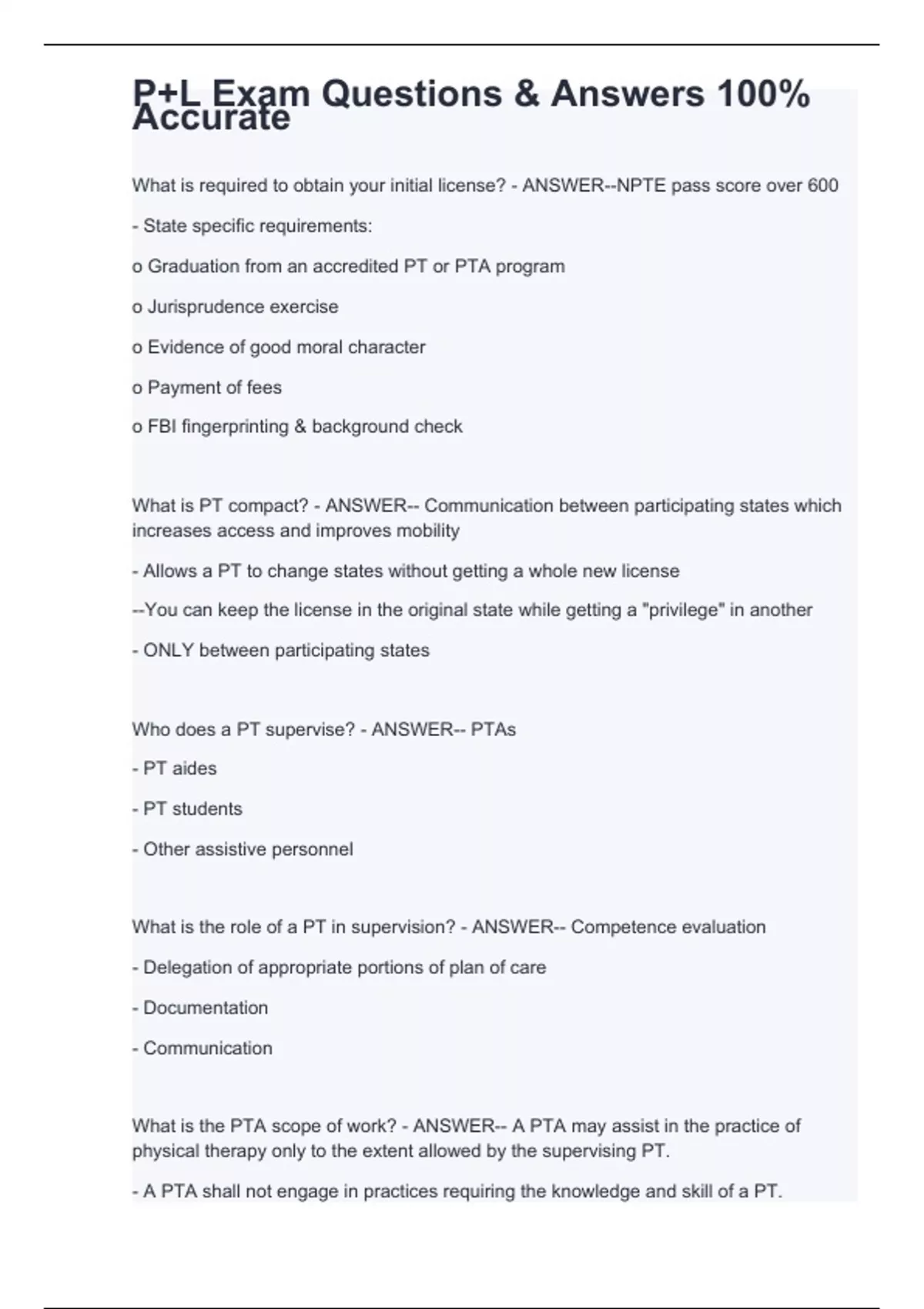 What is required to obtain your initial license? - ANSWER--NPTE pass score over 600 - State specific requirements: o Graduation from an accredited PT or PTA program o Jurisprudence exercise o Evidence of good moral character o Payment of fees o FBI fingerprinting & background check What is PT compact? - ANSWER-- Communication between participating states which increases access and improves mobility - Allows a PT to change states without getting a whole new license --You can keep the license in the original state while getting a "privilege" in another - ONLY between participating states Who does a PT supervise? - ANSWER-- PTAs - PT aides - PT students - Other assistive personnel What is the role of a PT in supervision? - ANSWER-- Competence evaluation - Delegation of appropriate portions of plan of care - Documentation - Communication