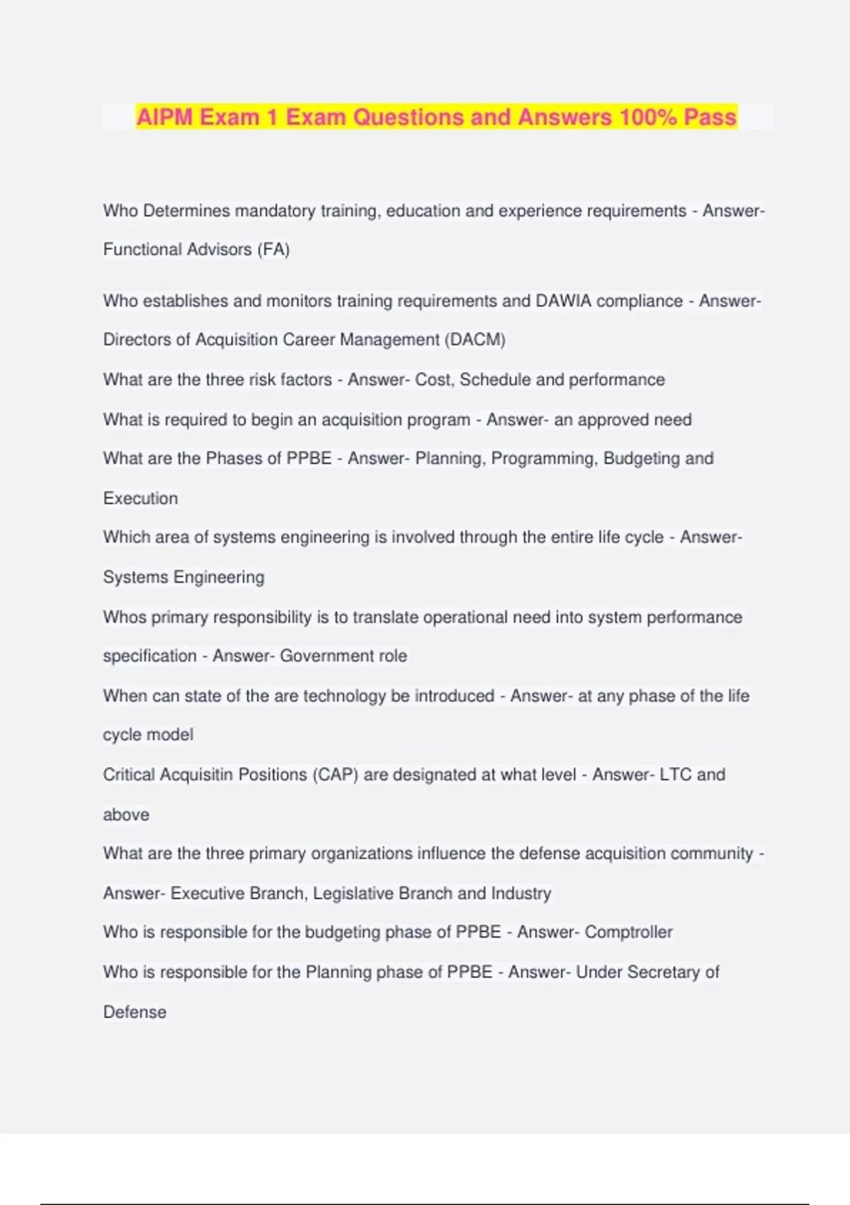 AIPM Exam 1 Exam Questions and Answers 100% Pass Who Determines mandatory training, education and experience requirements - Answer- Functional Advisors (FA) Who establishes and monitors training requirements and DAWIA compliance - Answer- Directors of Acquisition Career Management (DACM) What are the three risk factors - Answer- Cost, Schedule and performance What is required to begin an acquisition program - Answer- an approved need What are the Phases of PPBE - Answer- Planning, Programming, Budgeting and Execution Which area of systems engineering is involved through the entire life cycle - Answer- Systems Engineering Whos primary responsibility is to translate operational need into system performance specification - Answer- Government role When can state of the are technology be introduced - Answer- at any phase of the life cycle model Critical Acquisitin Positions (CAP) are designated at what level - Answer- LTC and above What are the three primary organizations influence the defense acquisition community - Answer- Executive Branch, Legislative Branch and Industry Who is responsible for the budgeting phase of PPBE - Answer- Comptroller Who is responsible for the Planning phase of PPBE - Answer- Under Secretary of Defense What ACAT level is reviewed by DAB? Who is the Chair - Answer- ACAT 1D-MDAP; Under Secretary for AT&L/DAE What ACAT level is reviewed by IPR? Who is the Chair - Answer- ACAT III, IPR Chair/PEO What ACAT level is reviewed by ASARC? Who is the Chair - Answer- ACAT 1C & II; ATL/AAE What resource specifies the criteria for ACAT level determination - Answer- DoDI 5000.02 What three things enable ACAT level s 4. indentification? - Answer- 1. Type of system 2. Level of Management review/decision authority 3. Applicable program reporting requirement 4. All of the above When does JCIDS occur - Answer- Before the Acquisition management process What are the three steps of JCIDS methodolgy - Answer- 1.Capbilities Based Assesment 2. Documentation of Capability Needs 3. Review,Validation, and Approval Where is the CPD prepared? - Answer- Prepared in the Engineering and Manufacturing Development (EMD) Phase What milestone is the CPD prepared for - Answer- Milestone C Which phase uses Low Rate Initial Production (LRIP) - Answer- Production and Deployment Who is the DAB Chair? - Answer- USD AT&L What is the final activity of the Life Cycle Model - Answer- Disposal What are the two reasons to initiate a new acquisition program - Answer- take advantage of new technology & react to an actual or potential threat. What are the 3 objectives of an Integrated Product and Process Development (IPPD) - Answer- Meet cost, schedule and performance objectives Product Design, manufacturing, business processes and sustainment process are optimized by utilization of what? - Answer- Mulitfuinctional teams What is an IPPD and give an example - Answer- Int