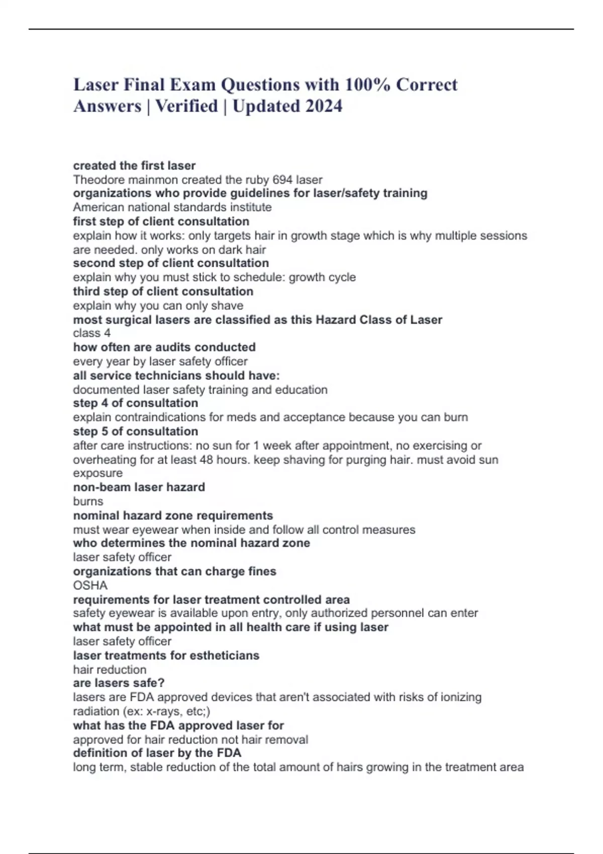Laser Final Exam Questions with 100% Correct Answers | Verified | Updated 2024 created the first laser Theodore mainmon created the ruby 694 laser organizations who provide guidelines for laser/safety training American national standards institute first step of client consultation explain how it works: only targets hair in growth stage which is why multiple sessions are needed. only works on dark hair second step of client consultation explain why you must stick to schedule: growth cycle third step of client consultation explain why you can only shave most surgical lasers are classified as this Hazard Class of Laser class 4 how often are audits conducted every year by laser safety officer all service technicians should have: documented laser safety training and education step 4 of consultation explain contraindications for meds and acceptance because you can burn step 5 of consultation after care instructions: no sun for 1 week after appointment, no exercising or overheating for at least 48 hours. keep shaving for purging hair. must avoid sun exposure non-beam laser hazard burns nominal hazard zone requirements must wear eyewear when inside and follow all control measures who determines the nominal hazard zone laser safety officer organizations that can charge fines OSHA requirements for laser treatment controlled area safety eyewear is available upon entry, only authorized personnel can enter what must be appointed in all health care if using laser laser safety officer laser treatments for estheticians hair reduction are lasers safe? lasers are FDA approved devices that aren't associated with risks of ionizing radiation (ex: x-rays, etc;) what has the FDA approved laser for approved for hair reduction not hair removal definition of laser by the FDA long term, stable reduction of the total amount of hairs growing in the treatment area