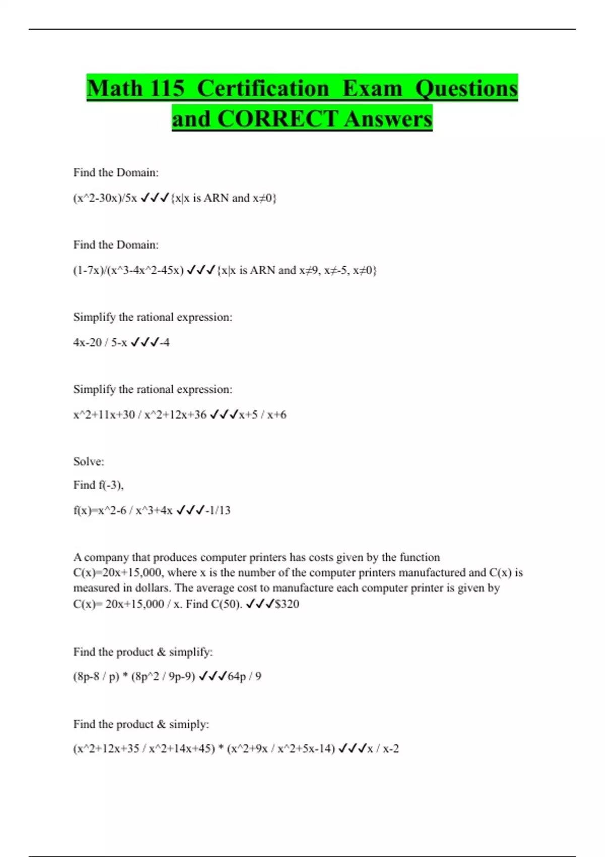 Find the Domain: (x^2-30x)/5x {x|x is ARN and x≠0} Find the Domain: (1-7x)/(x^3-4x^2-45x) {x|x is ARN and x≠9, x≠-5, x≠0} Simplify the rational expression: 4x-20 / 5-x -4 Simplify the rational expression: x^2+11x+30 / x^2+12x+36 x+5 / x+6 Solve: Find f(-3), f(x)=x^2-6 / x^3+4x -1/1