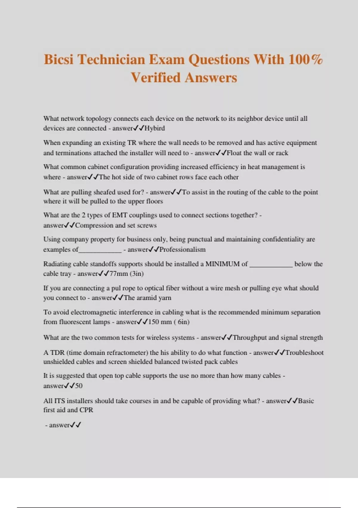 Bicsi Technician Exam Questions With 100% Verified Answers What network topology connects each device on the network to its neighbor device until all devices are connected - answerHybird When expanding an existing TR where the wall needs to be removed and has active equipment and terminations attached the installer will need to - answerFloat the wall or rack What common cabinet configuration providing increased efficiency in heat management is where - answerThe hot side of two cabinet rows face each other What are pulling sheafed used for? - answerTo assist in the routing of the cable to the point where it will be pulled to the upper floors