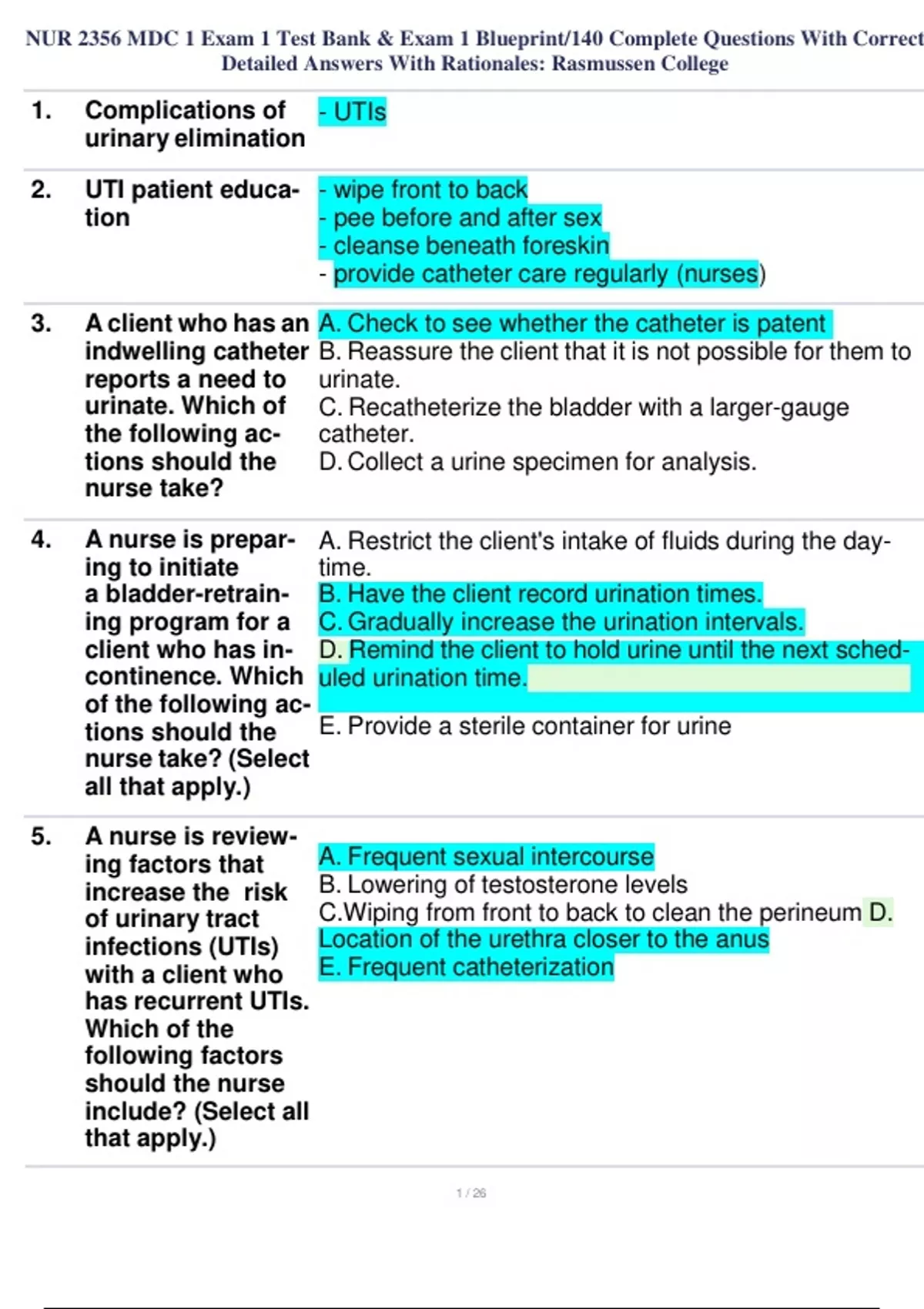 NUR 2356 MDC 1 Exam 1 Test Bank & Exam 1 Blueprint/140 Complete Questions With Correct Detailed Answers With Rationales: Rasmussen College