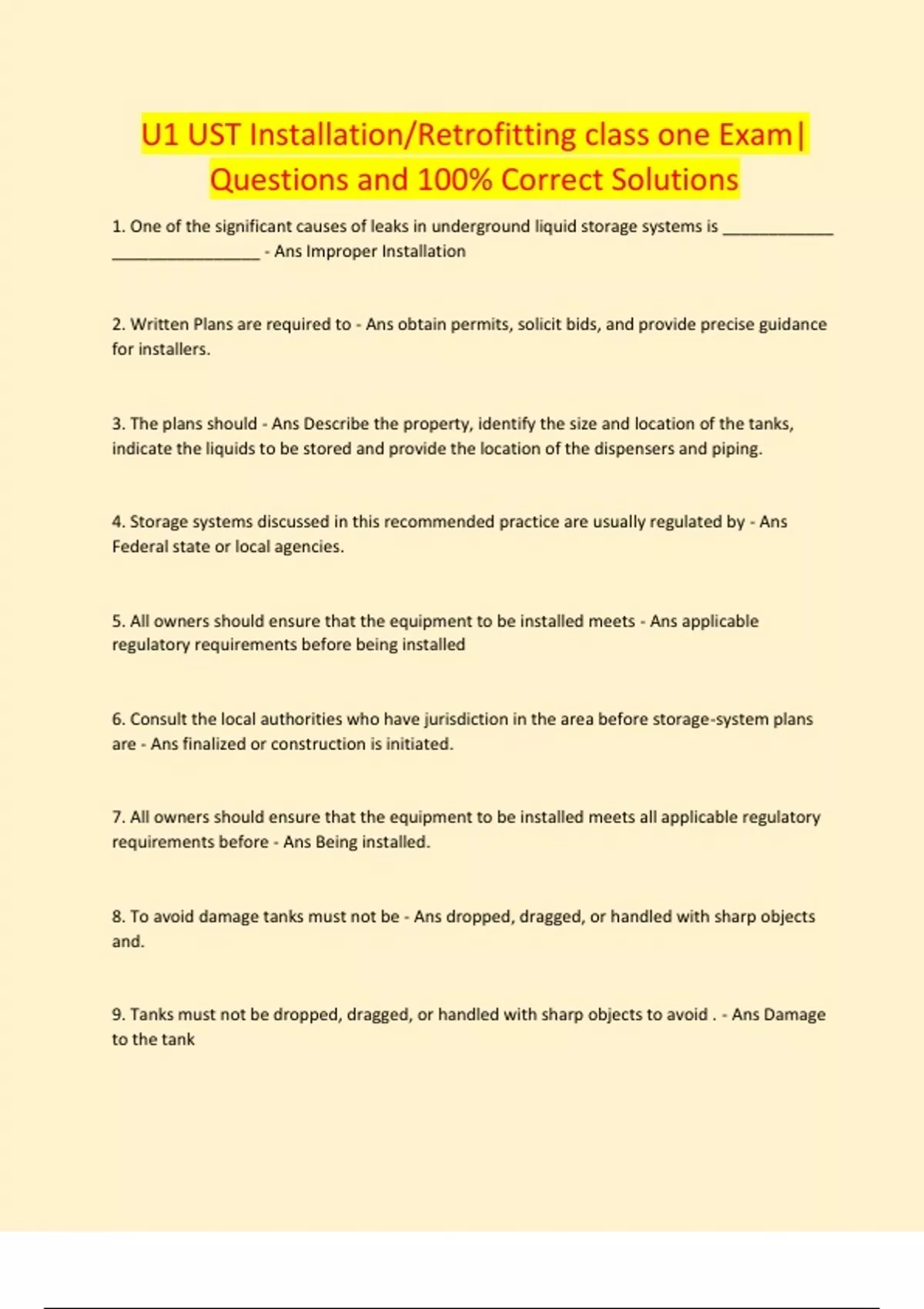 1. One of the significant causes of leaks in underground liquid storage systems is ____________ ________________ - Ans Improper Installation 2. Written Plans are required to - Ans obtain permits, solicit bids, and provide precise guidance for installers. 3. The plans should - Ans Describe the property, identify the size and location of the tanks, indicate the liquids to be stored and provide the location of the dispensers and piping. 4. Storage systems discussed in this recommended practice are usually regulated by - Ans Federal state or local agencies.