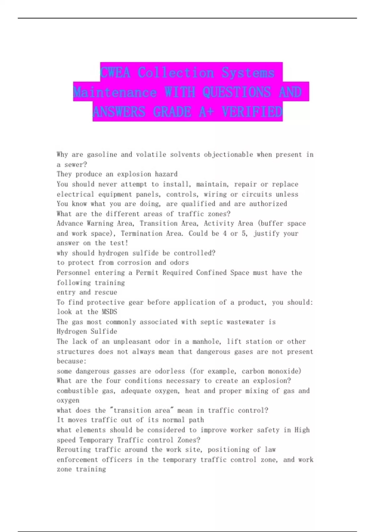 CWEA Collection Systems Maintenance WITH QUESTIONS AND ANSWERS GRADE A+ VERIFIED