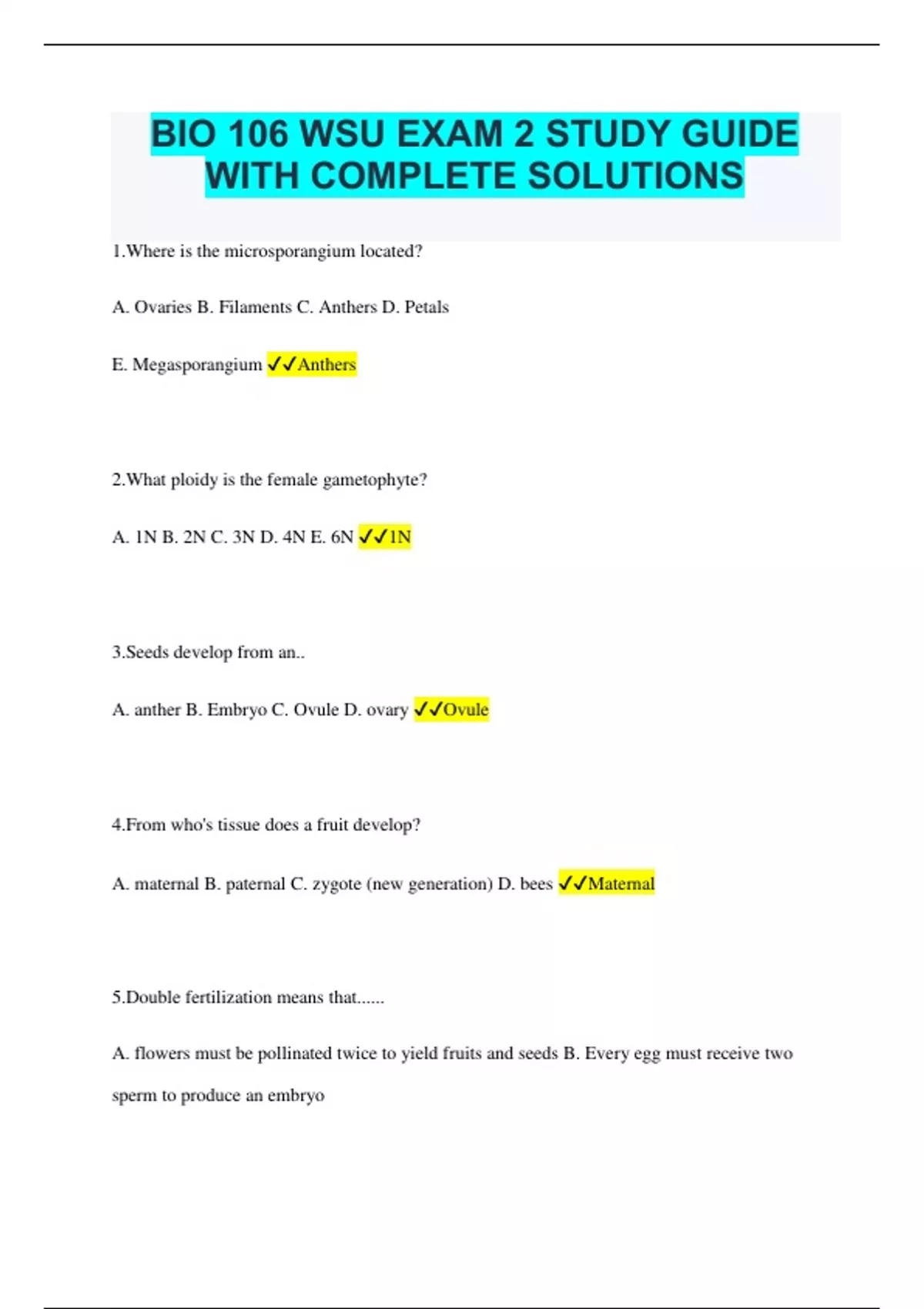 BIO 106 WSU EXAM 2 STUDY GUIDE WITH COMPLETE SOLUTIONS 1.Where is the microsporangium located? A. Ovaries B. Filaments C. Anthers D. Petals E. Megasporangium Anthers 2.What ploidy is the female gametophyte? A. 1N B. 2N C. 3N D. 4N E. 6N 1N 3.Seeds develop from an.. A. anther B. Embryo C. Ovule D. ovary Ovule 4.From who's tissue does a fruit develop? A. maternal B. paternal C. zygote (new generation) D. bees Maternal 5.Double fertilization means that...... A. flowers must be pollinated twice to yield fruits and seeds B. Every egg must receive two sperm to produce an embryo C. One sperm fertilizes the egg, and a second sperm fertilizes the polar nuclei D. Every sperm has two nuclei One sperm fertilizes the egg, and a second sperm fertilizes the polar nuclei 6.Which of the following is NOT a mechanism of seed dispersal? A. wind B. water C. pollination D. animal Pollination 7.What principle is this diagram showing? A. natural selection B. artificial selection C. GMOs C. cabbages taste bad D. if you plant a Brassica oleracea seed you have no idea what kind of plant you will get Artficial Selection 8.What kind of reproduction is this demonstrating? A. Asexual via plantlets B. Asexual via adventitious shoots C. fertilization D. apomixis E. Asexual via adventitious roots Asexual via adventitious roots 9."Golden Rice"... A. is resistant to various herbicides, making it practical to weed rice fields with those herbicides B. is resistant to a virus that commonly attacks rice fields C. includes a bacterial gene that produce toxin that reduces damage from insect pests D. Has a modified genome that includes transgenes that lead to an increase in vitamin A content. Has a modified genome that includes transgenes that lead to an increase in vitamin A content. 10. Charophytes... A. are a type of algae B. are closely related to land plants C. can survive brief periods of drying D. all of the above all of the above 11.Which of the following is not a difference between mosses and ferns? A. Ferns have a dominant gametophyte B. Mosses do not have xylem tissue C. Ferns have absorptive roots
