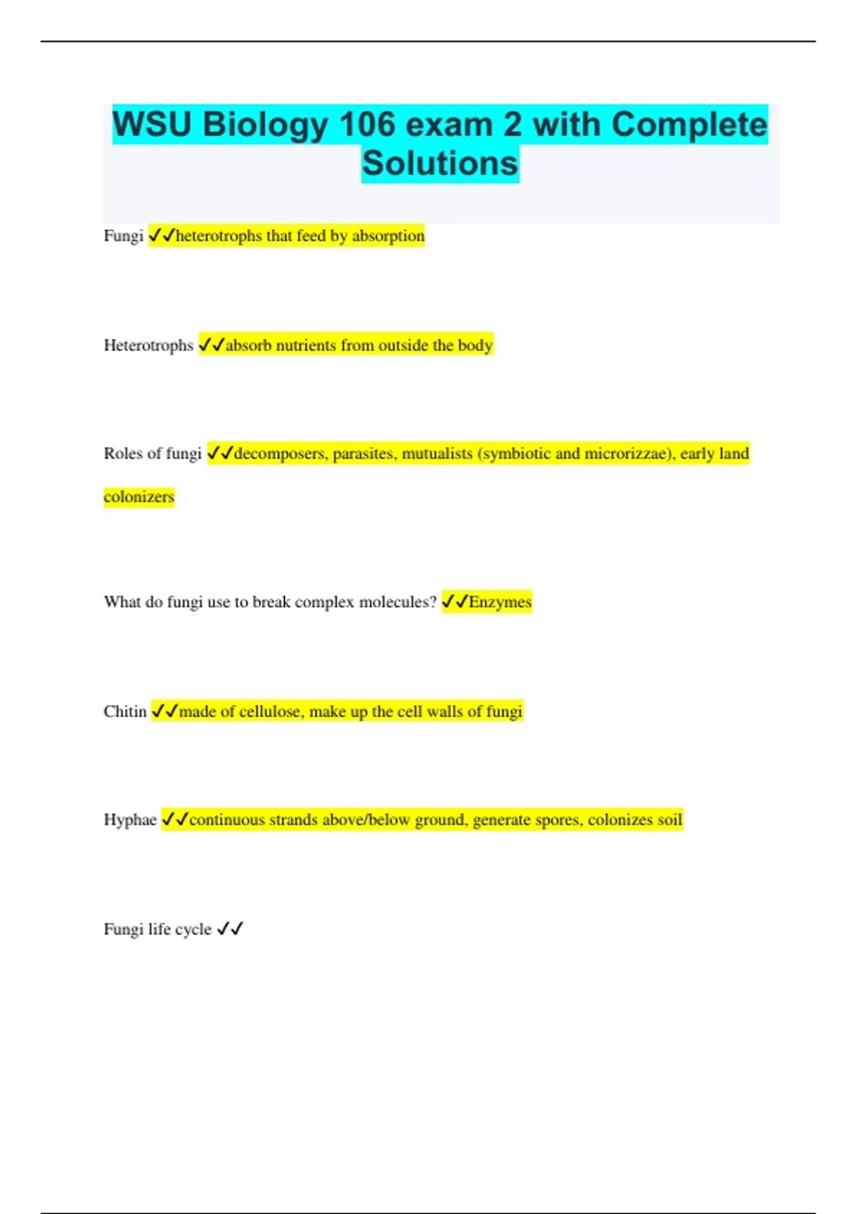 WSU Biology 106 exam 2 with Complete Solutions Fungi heterotrophs that feed by absorption Heterotrophs absorb nutrients from outside the body Roles of fungi decomposers, parasites, mutualists (symbiotic and microrizzae), early land colonizers What do fungi use to break complex molecules? Enzymes Chitin made of cellulose, make up the cell walls of fungi Hyphae continuous strands above/below ground, generate spores, colonizes soil Fungi life cycle Mycellum a collective group of hyphae Karyogamy fusion of genetic information Diploid phase following karyogamy short lived (2n) spore producing structures and (1n) spores Chytrids -found in freshwater and terrestrial habitats -decomposers, mutualistic, saprobic, or parasitic -diverged early in fungal evolution -zoospores: flagellated spores Zygomycetes fast growing bread and fruit molds, zygosporangia zygosporangia site of karyogamy and then meiosis Pilobolus aim their sporangia to the light Glomeromycetes Arbuscular mycorrhizae Mutually beneficial relationships between fungi and plant roots Mycorrhizae -"fungus roots" -delivers minerals and receives organic nutrients -increase plant productivity -strong added benefit to plants Ectomycorrhizal fungi grow in extracellular spaces of roots Endomycorrihizal fungi hyphae go through cell wall to plasma membrane Ascomycetes -produce saclike asci contained in fruiting bodies called ascocarps Ascocarps cup like structures that produce spores Basidiomycetes -Decomposers of wood -mushrooms, puffballs, shelf fungi, mycorrhizae, plant parasites Decomposers essential recycling between living and nonliving world Fungus plant symbiosis mycorrhizae Fungus animal symbiosis help break down