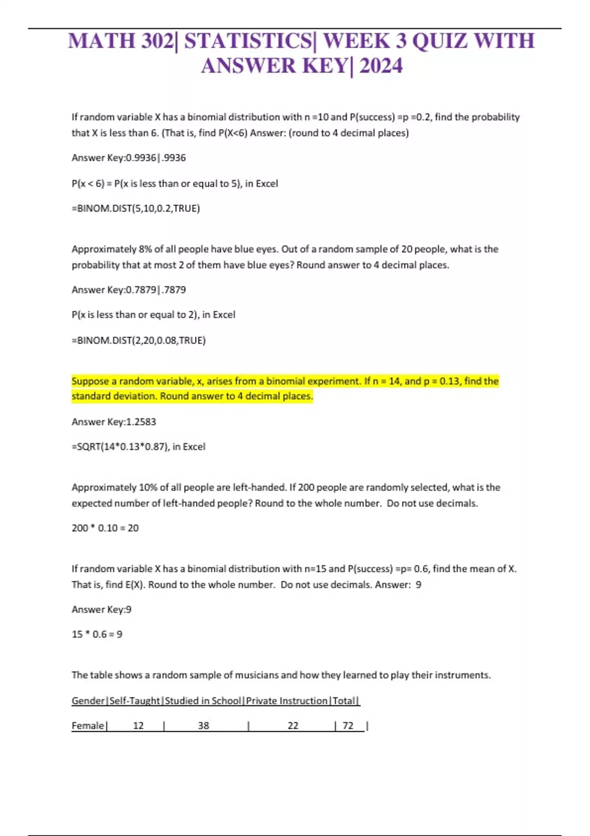 MATH 302| STATISTICS| WEEK 3 QUIZ WITH ANSWER KEY| 2024 If random variable X has a binomial distribution with n =10 and P(success) =p =0.2, find the probability that X is less than 6. (That is, find P(X6) Answer: (round to 4 decimal places) Answer Key:0.9936|.9936 P(x 6) = P(x is less than or equal to 5), in Excel =BINOM.DIST(5,10,0.2,TRUE) Approximately 8% of all people have blue eyes. Out of a random sample of 20 people, what is the probability that at most 2 of them have blue eyes? Round answer to 4 decimal places. Answer Key:0.7879|.7879 P(x is less than or equal to 2), in Excel =BINOM.DIST(2,20,0.08,TRUE) Suppose a random variable, x, arises from a binomial experiment. If n = 14, and p = 0.13, find the standard deviation. Round answer to 4 decimal places. Answer Key:1.2583 =SQRT(14*0.13*0.87), in Excel Approximately