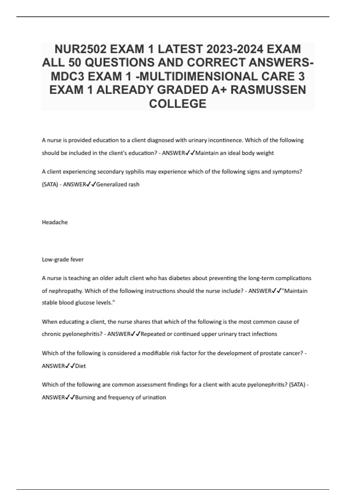 NUR2502 EXAM 1 LATEST EXAM ALL 50 QUESTIONS AND CORRECT ANSWERS-MDC3 EXAM 1 -MULTIDIMENSIONAL CARE 3 EXAM 1 ALREADY GRADED A+ RASMUSSEN COLLEGE