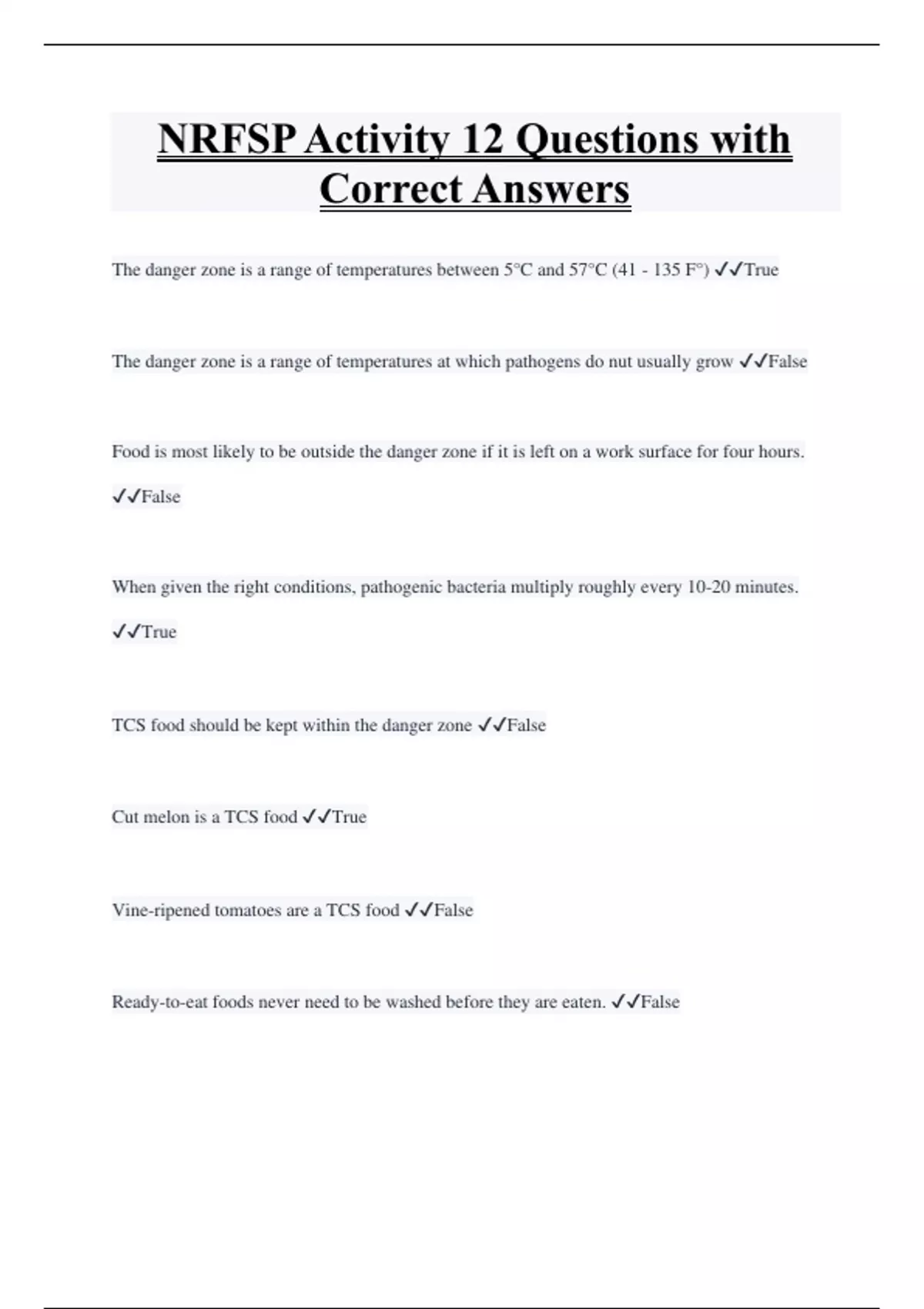 NRFSP Activity 12 Questions with Correct Answers The danger zone is a range of temperatures between 5°C and 57°C (41 - 135 F°) True The danger zone is a range of temperatures at which pathogens do nut usually grow False Food is most likely to be outside the danger zone if it is left on a work surface for four hours. False When given the right conditions, pathogenic bacteria multiply roughly every 10-20 minutes. True TCS food should be kept within the danger zone False Cut melon is a TCS food True Vine-ripened tomatoes are a TCS food False