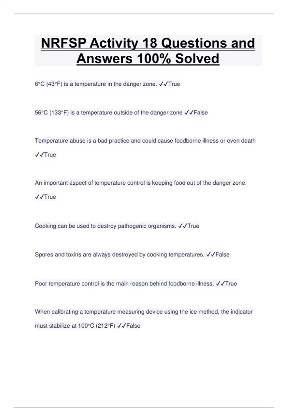 NRFSP Activity 18 Questions and Answers 100% Solved 6°C (43°F) is a temperature in the danger zone. True 56°C (133°F) is a temperature outside of the danger zone False Temperature abuse is a bad practice and could cause foodborne illness or even death True An important aspect of temperature control is keeping food out of the danger zone. True Cooking can be used to destroy pathogenic organisms. True Spores and toxins are always destroyed by cooking temperatures. False Poor temperature control is the main reason behind foodborne illness. True