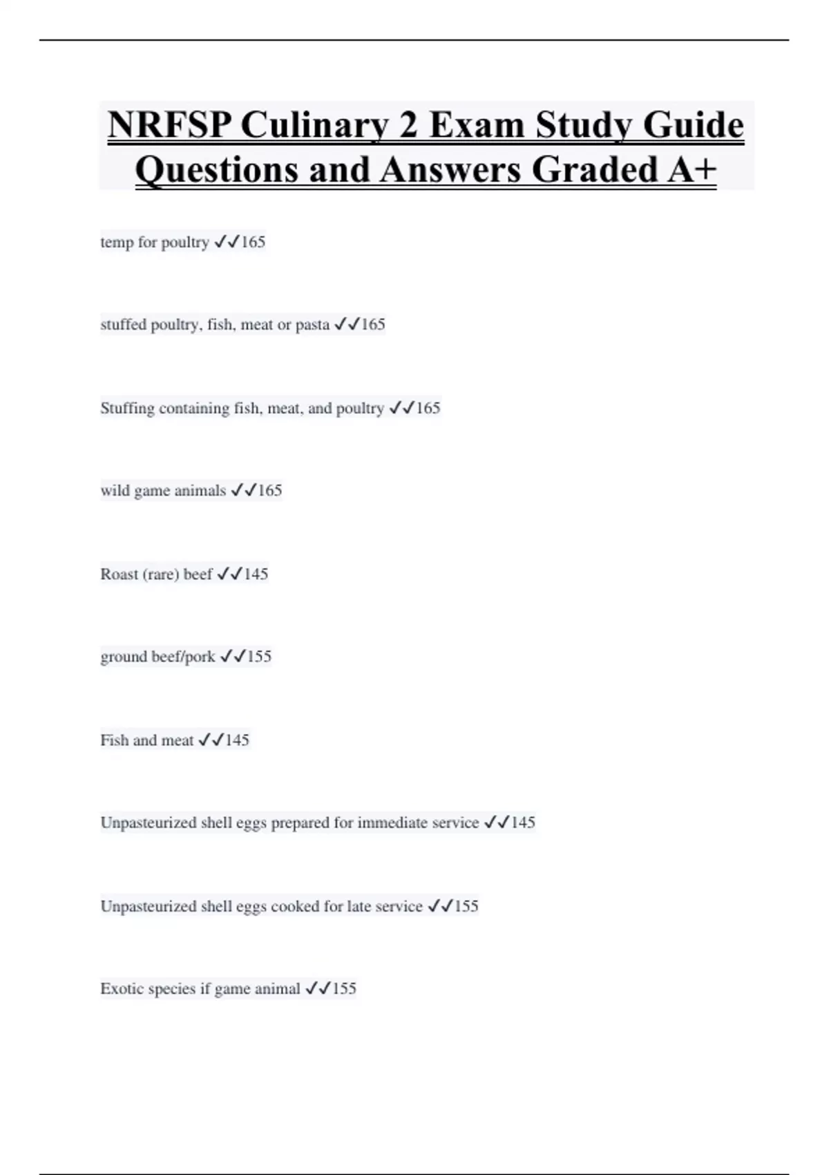 NRFSP Culinary 2 Exam Study Guide Questions and Answers Graded A+ temp for poultry 165 stuffed poultry, fish, meat or pasta 165 Stuffing containing fish, meat, and poultry 165 wild game animals 165 Roast (rare) beef 145 ground beef/pork 155 Fish and meat 145 Unpasteurized shell eggs prepared for immediate service 145 Unpasteurized shell eggs cooked for late service 155
