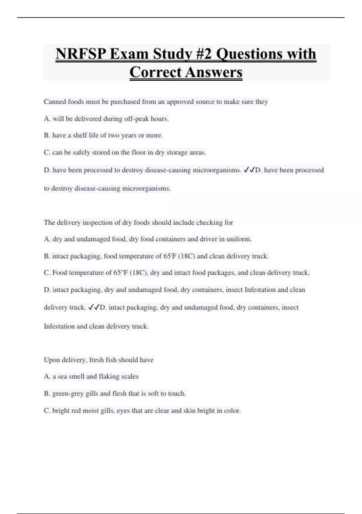 NRFSP Exam Study #2 Questions with Correct Answers Canned foods must be purchased from an approved source to make sure they A. will be delivered during off-peak hours. B. have a shelf life of two years or more. C. can be safely stored on the floor in dry storage areas. D. have been processed to destroy disease-causing microorganisms. D. have been processed to destroy disease-causing microorganisms. The delivery inspection of dry foods should include checking for A. dry and undamaged food, dry food containers and driver in uniform. B. intact packaging, food temperature of 65'F (18C) and clean delivery truck. C. Food temperature of 65°F (18C), dry and intact food packages, and clean delivery truck. D. intact packaging, dry and undamaged food, dry containers, insect Infestation and clean delivery truck. D. intact packaging, dry and undamaged food, dry containers, insect Infestation and clean delivery truck