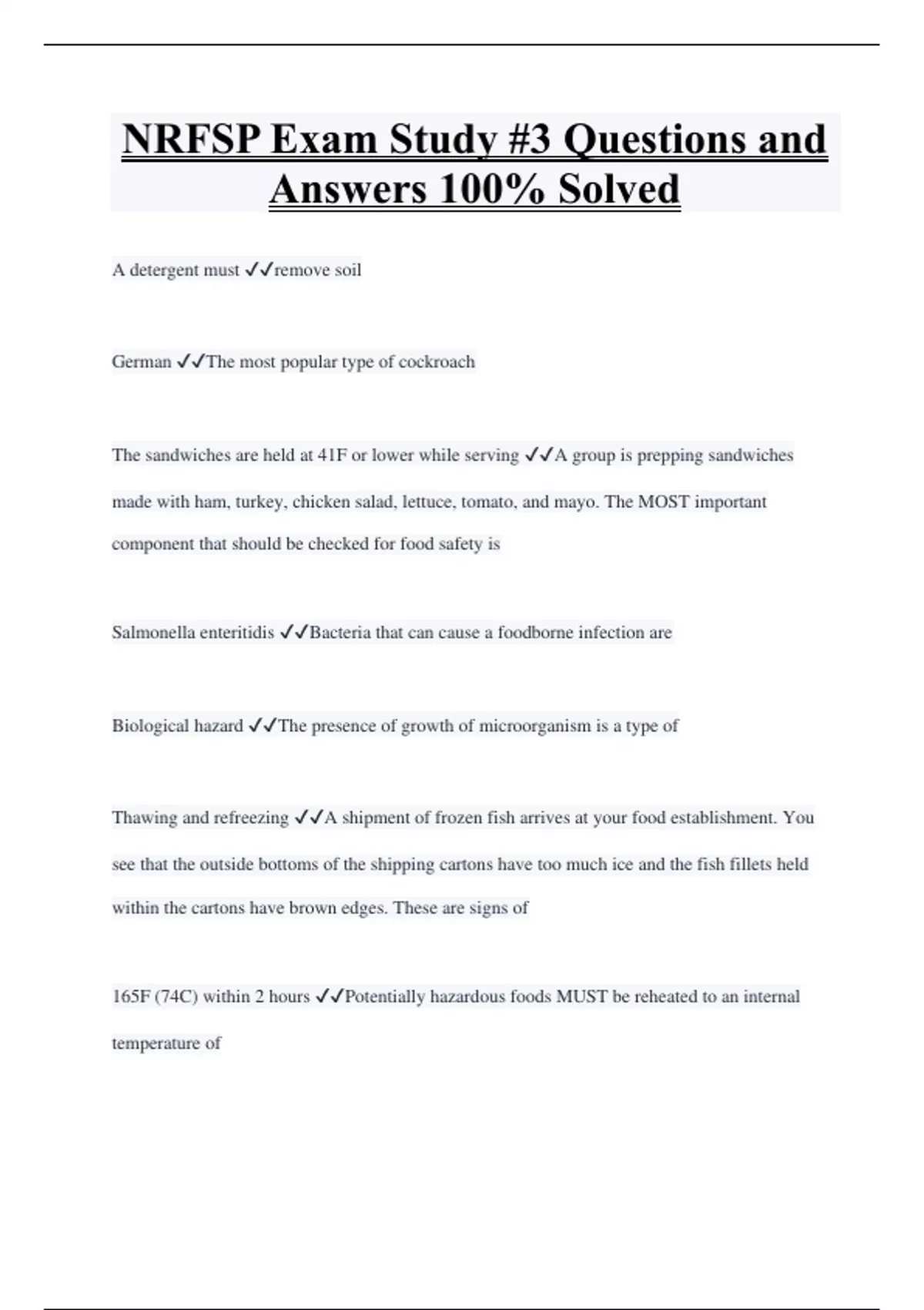 NRFSP Exam Study #3 Questions and Answers 100% Solved A detergent must remove soil German The most popular type of cockroach The sandwiches are held at 41F or lower while serving A group is prepping sandwiches made with ham, turkey, chicken salad, lettuce, tomato, and mayo. The MOST important component that should be checked for food safety is Salmonella enteritidis Bacteria that can cause a foodborne infection are Biological hazard The presence of growth of microorganism is a type of Thawing and refreezing A shipment of frozen fish arrives at your food establishment. You see that the outside bottoms of the shipping cartons have too much ice and the fish fillets held within the cartons have brown edges. These are signs of