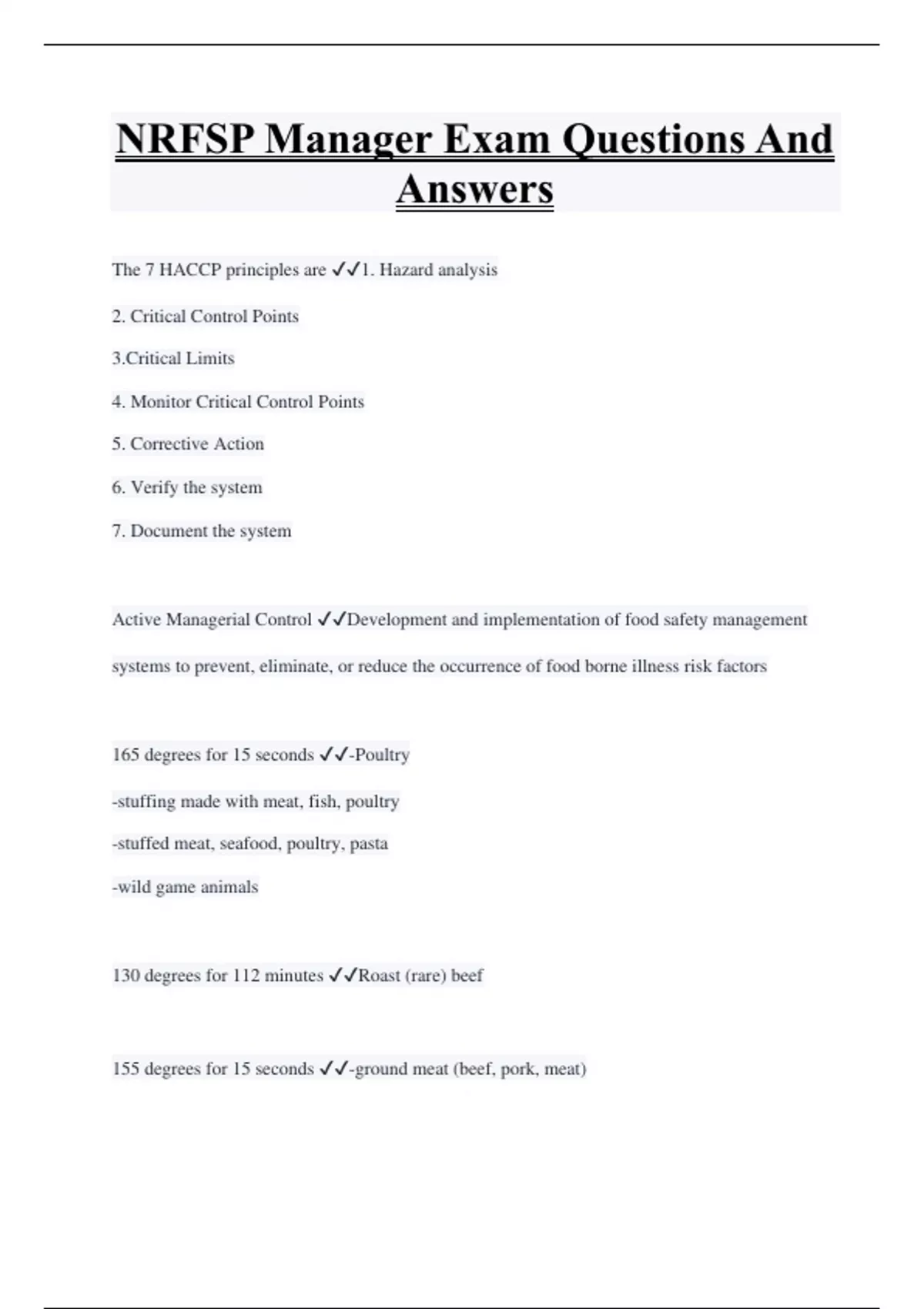NRFSP Manager Exam Questions And Answers The 7 HACCP principles are 1. Hazard analysis 2. Critical Control Points 3.Critical Limits 4. Monitor Critical Control Points 5. Corrective Action 6. Verify the system 7. Document the system Active Managerial Control Development and implementation of food safety management systems to prevent, eliminate, or reduce the occurrence of food borne illness risk factors 165 degrees for 15 seconds -Poultry -stuffing made with meat, fish, poultry -stuffed meat, seafood, poultry, pasta -wild game animal