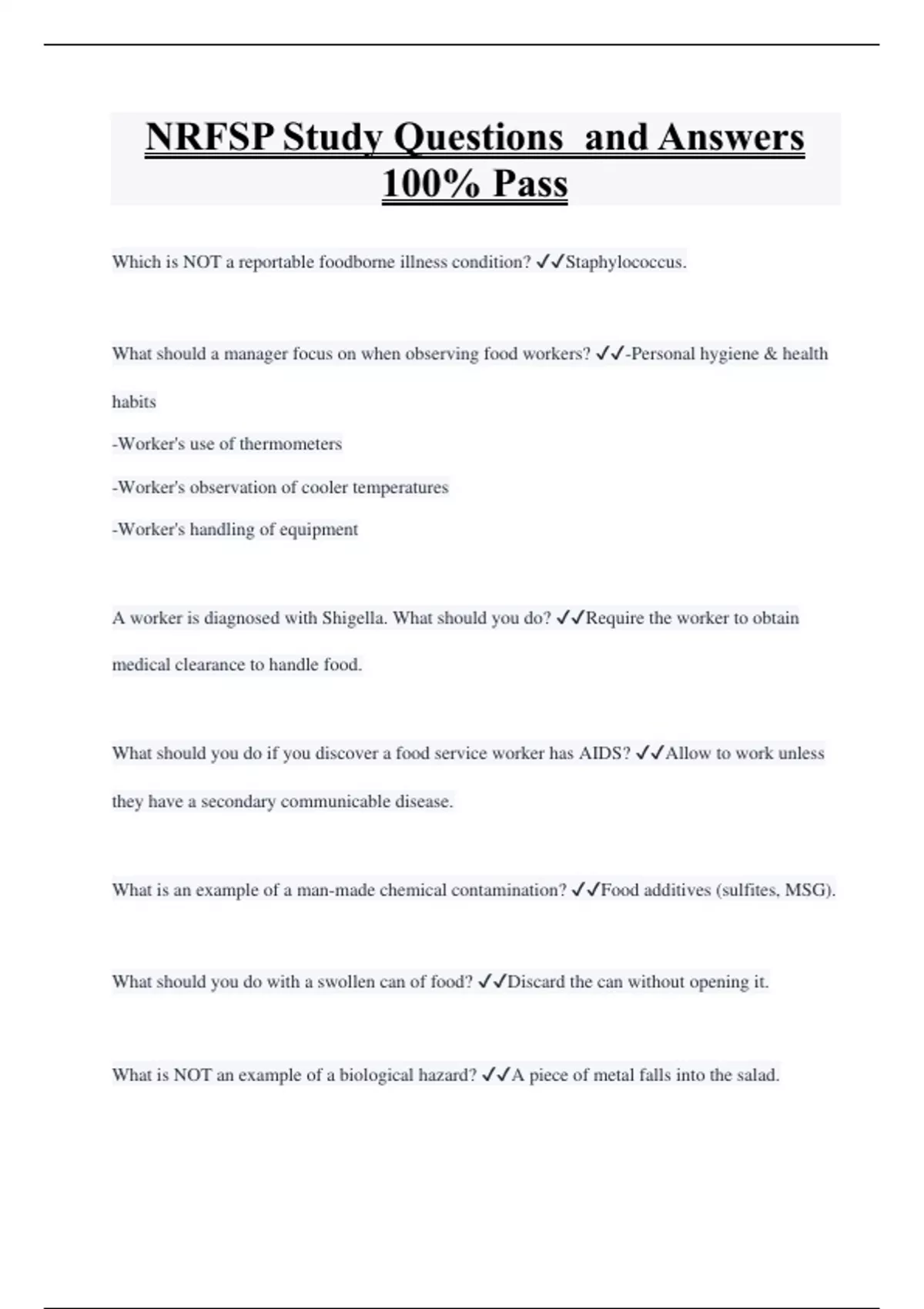 NRFSP Study Questions and Answers 100% Pass Which is NOT a reportable foodborne illness condition? Staphylococcus. What should a manager focus on when observing food workers? -Personal hygiene & health habits -Worker's use of thermometers -Worker's observation of cooler temperatures -Worker's handling of equipment A worker is diagnosed with Shigella. What should you do? Require the worker to obtain medical clearance to handle food. What should you do if you discover a food service worker has AIDS? Allow to work unless they have a secondary communicable disease. What is an example of a man-made chemical contamination? Food additives (sulfites, MSG). What should you do with a swollen can of food? Discard the can without opening it.