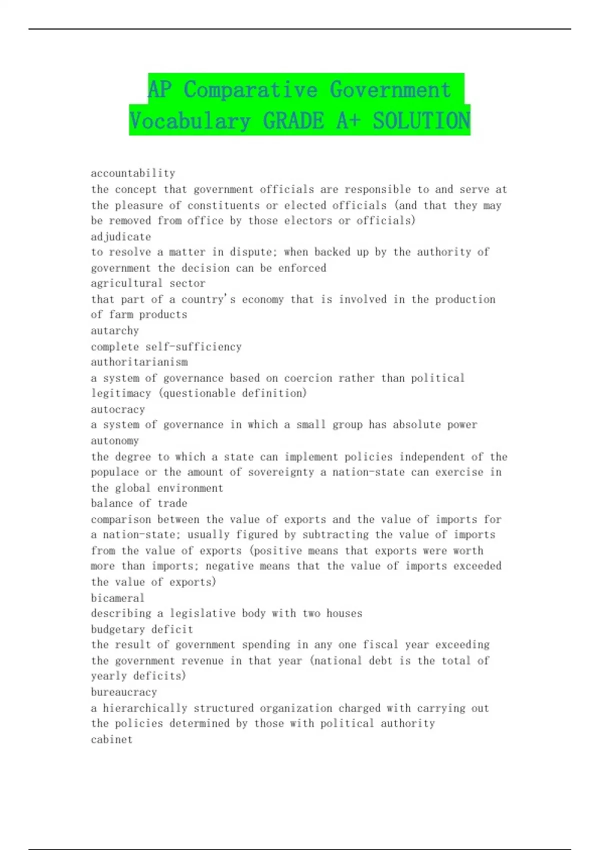 AP Comparative Government Vocabulary GRADE A+ SOLUTION