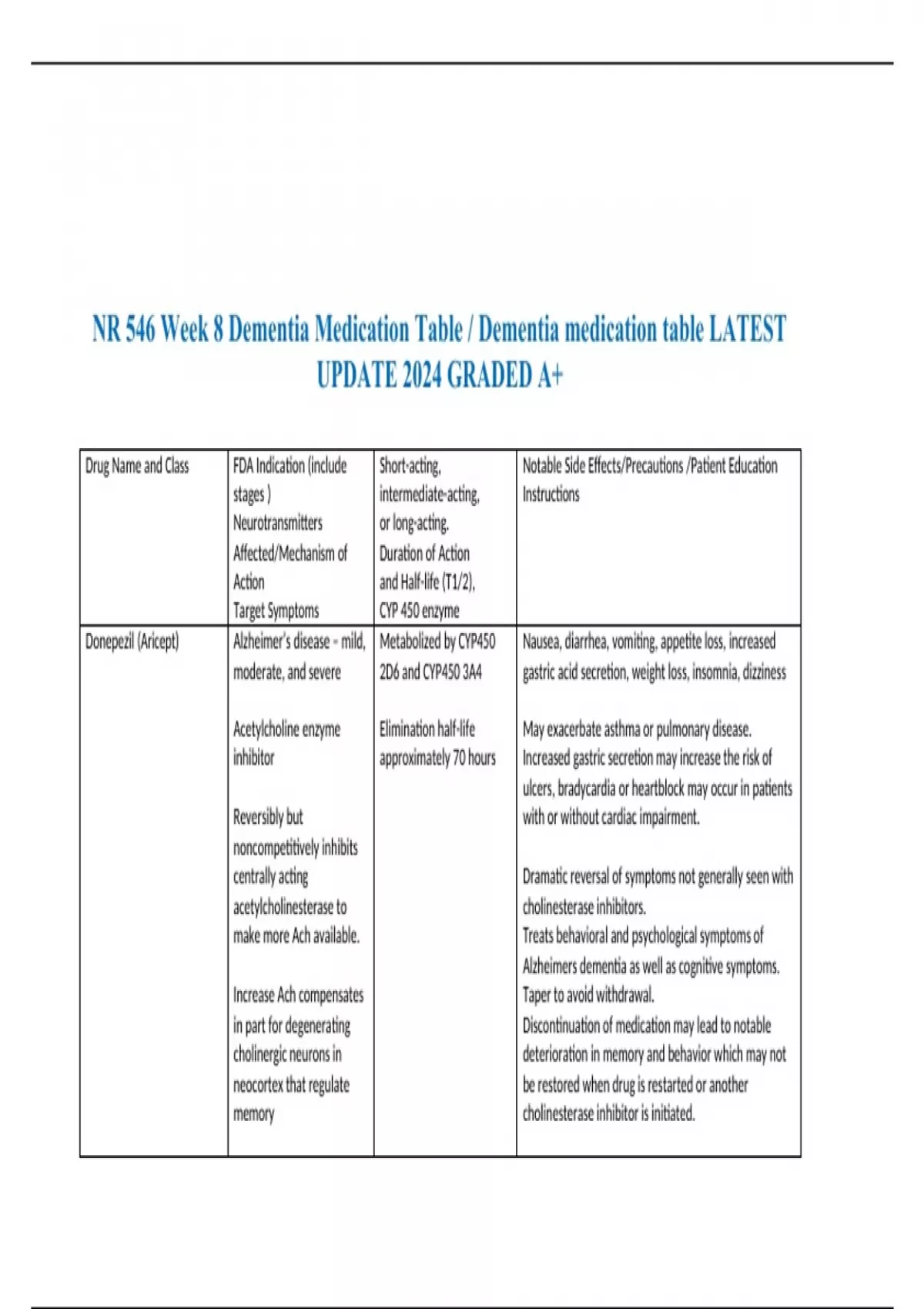 NR 546 Week 8 Dementia Medication Table / Dementia medication table LATEST UPDATE 2024 GRADED A+ Drug Name and Class FDA Indication (include stages ) Neurotransmitters Affected/Mechanism of Action Target Symptoms Short-acting, intermediate-acting, or long-acting. Duration of Action and Half-life (T1/2), CYP 450 enzyme Notable Side Effects/Precautions /Patient Education Instructions