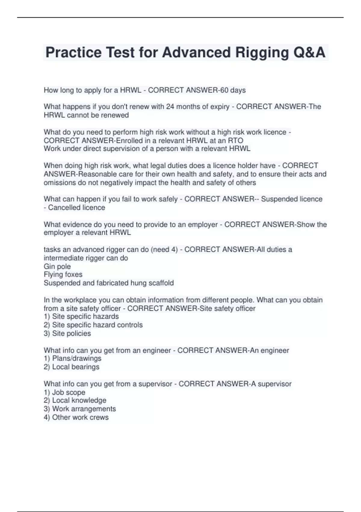 Practice Test for Advanced Rigging Q&A How long to apply for a HRWL - CORRECT ANSWER-60 days What happens if you don't renew with 24 months of expiry - CORRECT ANSWER-The HRWL cannot be renewed What do you need to perform high risk work without a high risk work licence - CORRECT ANSWER-Enrolled in a relevant HRWL at an RTO Work under direct supervision of a person with a relevant HRWL When doing high risk work, what legal duties does a licence holder have - CORRECT ANSWER-Reasonable care for their own health and safety, and to ensure their acts and omissions do not negatively impact the health and safety of others What can happen if you fail to work safely - CORRECT ANSWER-- Suspended licence - Cancelled licence What evidence do you need to provide to an employer - CORRECT ANSWER-Show the employer a relevant HRWL tasks an advanced rigger can do (need 4) - CORRECT ANSWER-All duties a intermediate rigger can do Gin pole Flying foxes Suspended and fabricated hung scaffold In the workplace you can obtain information from different people. What can you obtain from a site safety officer - CORRECT ANSWER-Site safety officer 1) Site specific hazards 2) Site specific hazard controls 3) Site policies What info can you get from an engineer - CORRECT ANSWER-An engineer 1) Plans/drawings 2) Local bearings What info can you get from a supervisor - CORRECT ANSWER-A supervisor 1) Job scope 2) Local knowledge 3) Work arrangements 4) Other work crew