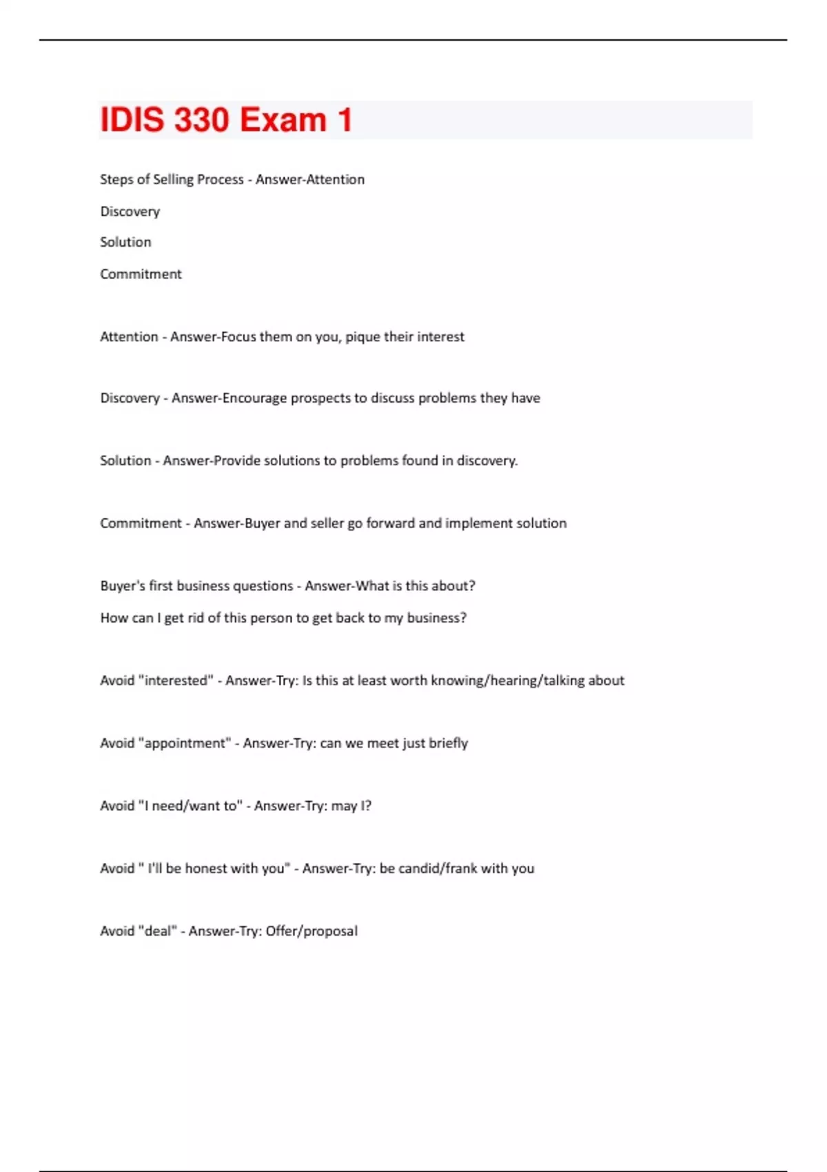 Steps of Selling Process - Answer-Attention Discovery Solution Commitment Attention - Answer-Focus them on you, pique their interest Discovery - Answer-Encourage prospects to discuss problems they have Solution - Answer-Provide solutions to problems found in discovery. Commitment - Answer-Buyer and seller go forward and implement solution Buyer's first business questions - Answer-What is this about? How can I get rid of this person to get back to my business? Avoid "interested" - Answer-Try: Is this at least worth knowing/hearing/talking about Avoid "appointment" - Answer-Try: can we meet just briefly Avoid "I need/want to" - Answer-Try: may I? Avoid " I'll be honest with you" - Answer-Try: be candid/frank with you Avoid "deal" - Answer-Try: Offer/proposalBenefit statement - Answer-focus attention on you and help them see value of spending time with you Example benefit statements - Answer-we may be able to we might be able to its possible we can Basic buying motives - Answer-potential problem fear of loss hope of gain availability