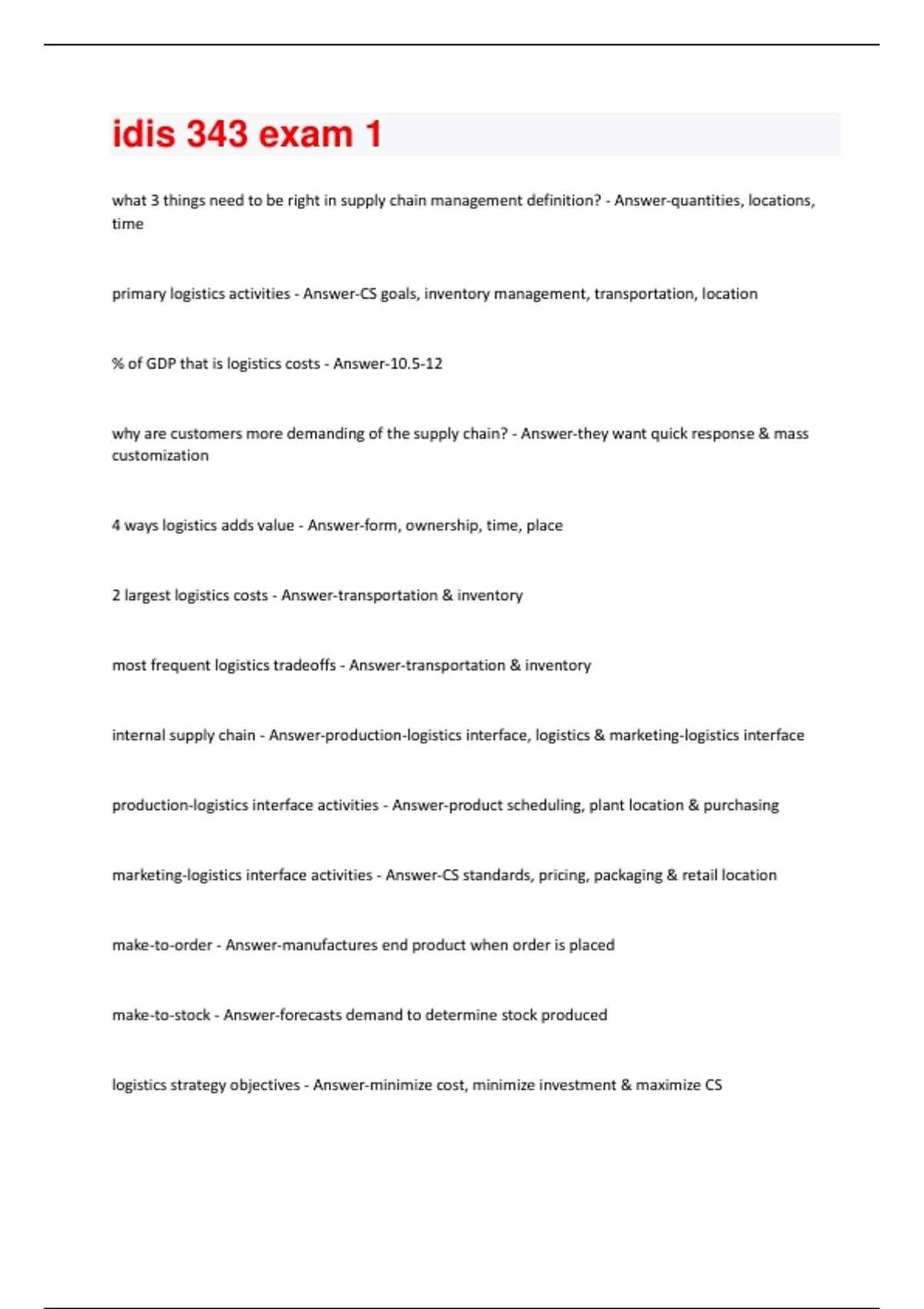 what 3 things need to be right in supply chain management definition? - Answer-quantities, locations, time primary logistics activities - Answer-CS goals, inventory management, transportation, location % of GDP that is logistics costs - Answer-10.5-12 why are customers more demanding of the supply chain? - Answer-they want quick response & mass customization 4 ways logistics adds value - Answer-form, ownership, time, place 2 largest logistics costs - Answer-transportation & inventory most frequent logistics tradeoffs - Answer-transportation & inventory internal supply chain - Answer-production-logistics interface, logistics & marketing-logistics interface production-logistics interface activities - Answer-product scheduling, plant location & purchasing marketing-logistics interface activities - Answer-CS standards, pricing, packaging & retail location make-to-order - Answer-manufactures end product when order is placed make-to-stock - Answer-forecasts demand to determine stock produced logistics strategy objectives - Answer-minimize cost, minimize investment & maximize CSlevels of logistical planning - Answer-strategic, tactical, operational 4 problem areas of supply chain planning - Answer-CS levels, facility location, inventory decisions, transportation decisions return on logistics assets equation - Answer-(revenue-costs)/logistics assets 6 concepts for logistics strategy formulation - Answer-total cost concept, differentiated distribution, mixed strategy, postponement, shipment consolidation, product standardization 7 supply chain management principles - Answer-segment, market demand signals, supply-chain-wide technology strategy, source strategically, channel-spanning performance measures, customize logistics network, differentiate products supply-to-stock - Answer-efficient supply chain supply-to-order - Answer-responsive supply chain functional products use- - Answer-efficient supply chain innovative products use- - Answer-responsive supply chain product life-cycle curve elements - Answer-introduction, growth, maturity, decline as weight-bulk ratio _________, transportation & storage costs _________ - Answer-increases; decrease as value-weight ratio increases, storage costs _______ and transportation costs ________ - Answerincrease; decrease6 values of product packaging - Answer-facilitate storage & handling & product use, promote better utilization of transport, protection, promote sales, change weight-to-bulk ratio, provide reuse value for customer most important value of product packaging - Answer-protection customer service elements - Answer-price, product quality & service CS is important part of marketing mix of- - Answer-price, product, promotion, place FOB pricing - Answer-free on board; who has ownership at what point importance of logistics CS - Answer-increase sales, increase market share, increase profit contribution & growth service differences have been shown to account for _-_% variation in supplier sales - Answer-5-6 _ times more difficult to develop a new customer than to keep an old one - Answer-6 most important CS elements - Answer-on-time delivery, order fill rate, product condition, accurate documentation most common CS complaint - Answer-late deliveries most common penalty for CS failure - Answer-reduced volume of business order cycle time - Answer-time elapsed between when a customer places an order and when the order is received by the customer 5 order cycle elements - Answer-transport time, order transmittal time, order processing & assembly line, production time & stock availabilityorder cycle time is expressed as _______ __________ _____________ - Answer-bimodal frequency distribution 3 constraints on order cycle time - Answer-order processing priorities, order condition standards & order constraints dominant CS elements are ___________ in nature - Answer-logistical most important service element - Answer-speed of delivery