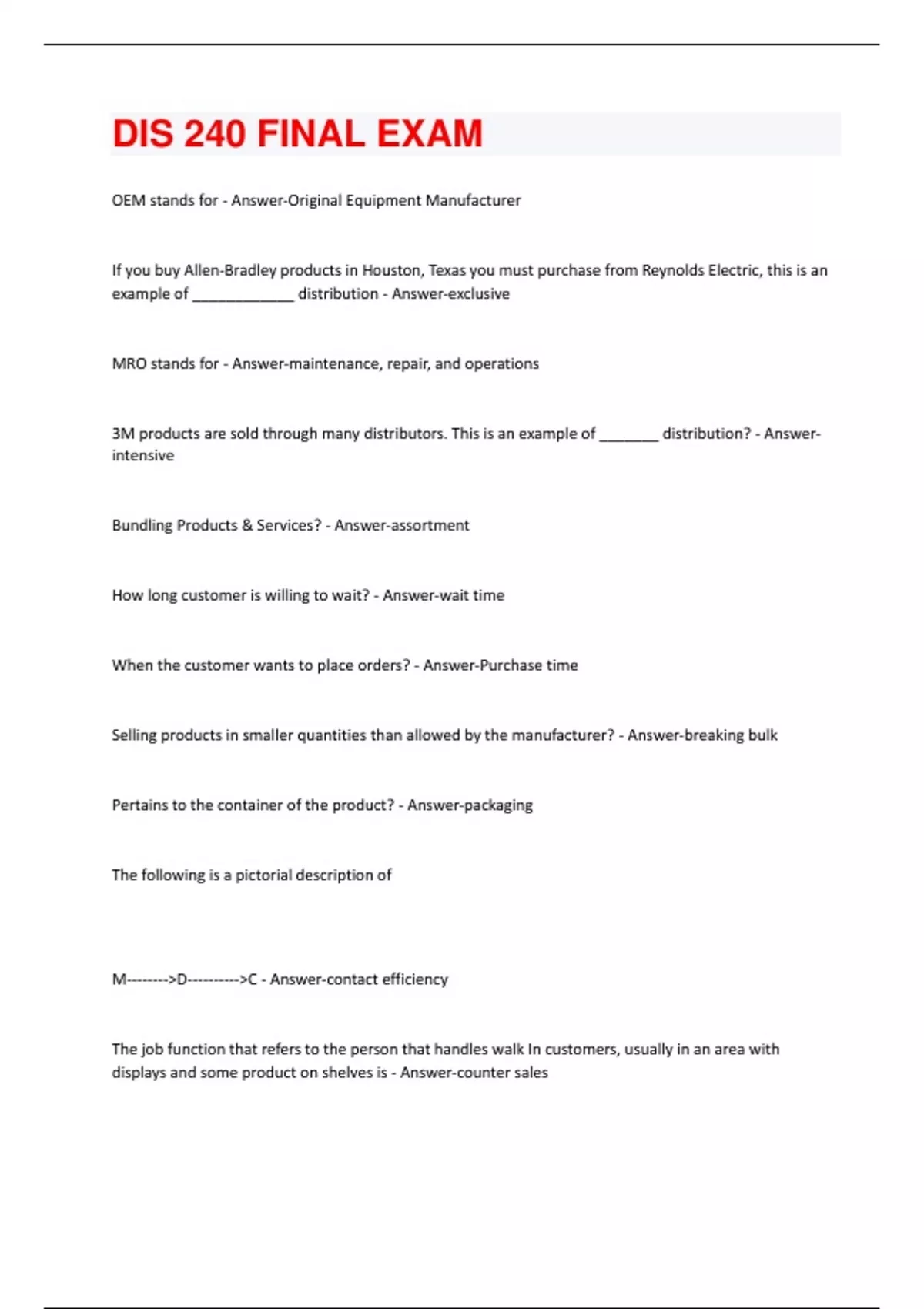OEM stands for - Answer-Original Equipment Manufacturer If you buy Allen-Bradley products in Houston, Texas you must purchase from Reynolds Electric, this is an example of ____________ distribution - Answer-exclusive MRO stands for - Answer-maintenance, repair, and operations 3M products are sold through many distributors. This is an example of _______ distribution? - Answerintensive Bundling Products & Services? - Answer-assortment How long customer is willing to wait? - Answer-wait time When the customer wants to place orders? - Answer-Purchase time Selling products in smaller quantities than allowed by the manufacturer? - Answer-breaking bulk Pertains to the container of the product? - Answer-packaging The following is a pictorial description of M-------->D---------->C - Answer-contact efficiency The job function that refers to the person that handles walk In customers, usually in an area with displays and some product on shelves is - Answer-counter salesThe function that occurs right after a product is delivered to a distributor and while the delivery truck is checked for accuracy - Answer-receiving PAID stands for - Answer-professional association for industrial distribution The process that takes place directly after an order ticket has been printed for an order that is scheduled to be shipped, and is also known as picking - Answer-order filling The process of buying product not currently in stock in our warehouse from our competitors or other local sources to complete a customer transaction is a - Answer-Buy-out The person responsible for meeting the customer at the customers location is often referred to as - Answer-outside sales Which of the following are specific service outputs provided by the typical industrial distributor A) Local inventory B) Transportation to the customers place of business C) service after the sale D) A and B E) All of the above - Answer-All of the above