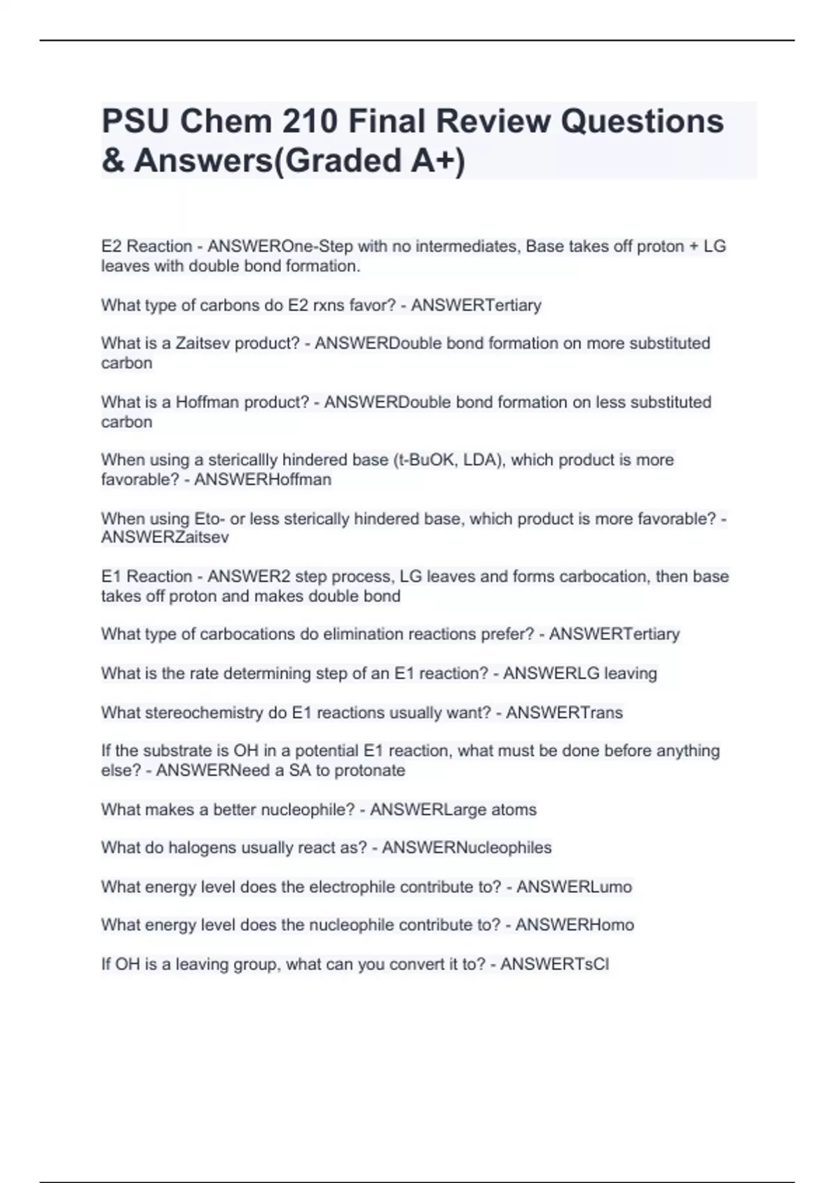PSU Chem 210 Final Review Questions & Answers(Graded A+) E2 Reaction - ANSWEROne-Step with no intermediates, Base takes off proton + LG leaves with double bond formation. What type of carbons do E2 rxns favor? - ANSWERTertiary What is a Zaitsev product? - ANSWERDouble bond formation on more substituted carbon What is a Hoffman product? - ANSWERDouble bond formation on less substituted carbon When using a stericallly hindered base (t-BuOK, LDA), which product is more favorable? - ANSWERHoffman When using Eto- or less sterically hindered base, which product is more favorable? - ANSWERZaitsev E1 Reaction - ANSWER2 step process, LG leaves and forms carbocation, then base takes off proton and makes double bond What type of carbocations do elimination reactions prefer? - ANSWERTertiary What is the rate determining step of an E1 reaction? - ANSWERLG leaving